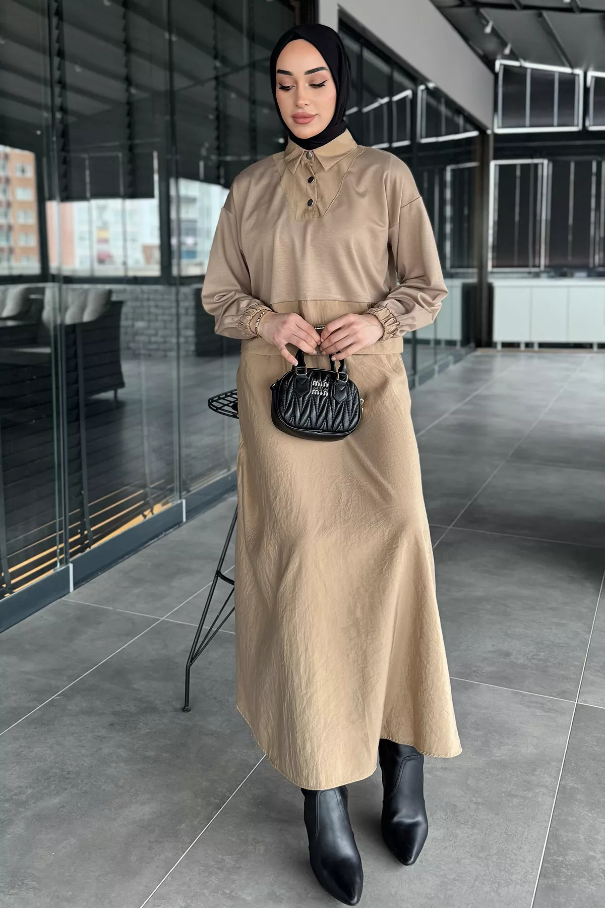 Bej Bel Lastikli Paraşüt Garnili Yaka Çıtçıt Detaylı Bluz Etek Tesettür İkili Takım Bej Bel Lastikli Paraşüt Garnili Yaka Çıtçıt Detaylı Bluz Etek Tesettür İkili Takım ZP-00015803 2XL