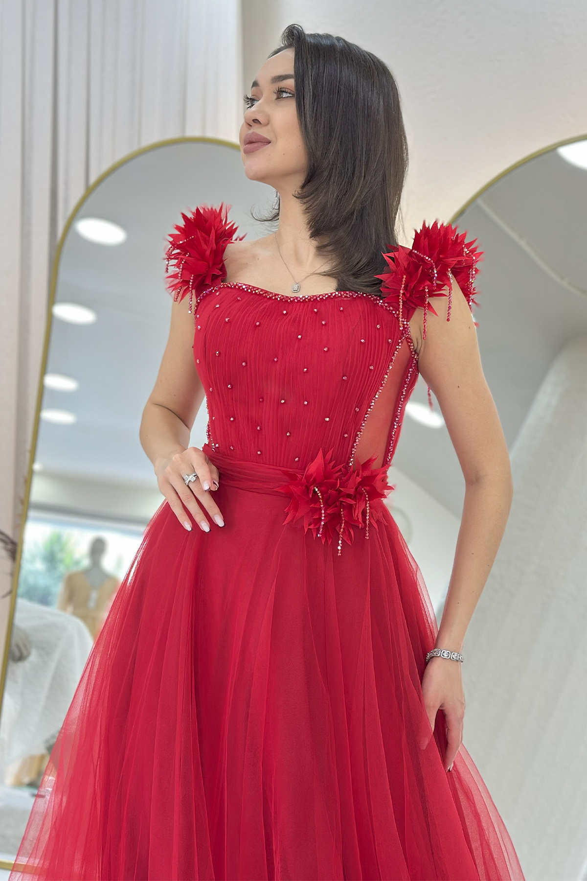 Kırmızı Omuz Çiçekli Transparan Detay İşlemeli Prenses Model Tül Kına Abiye Elbise Kırmızı Omuz Çiçekli Transparan Detay İşlemeli Prenses Model Tül Kına Abiye Elbise 000441 XL