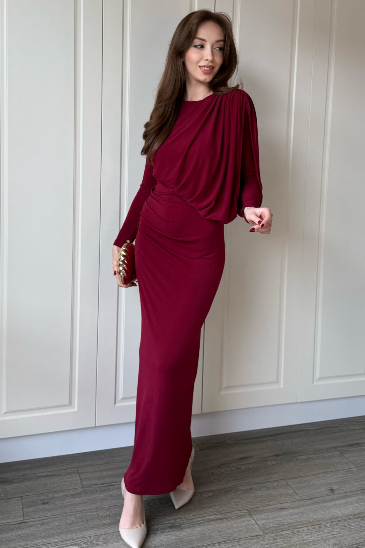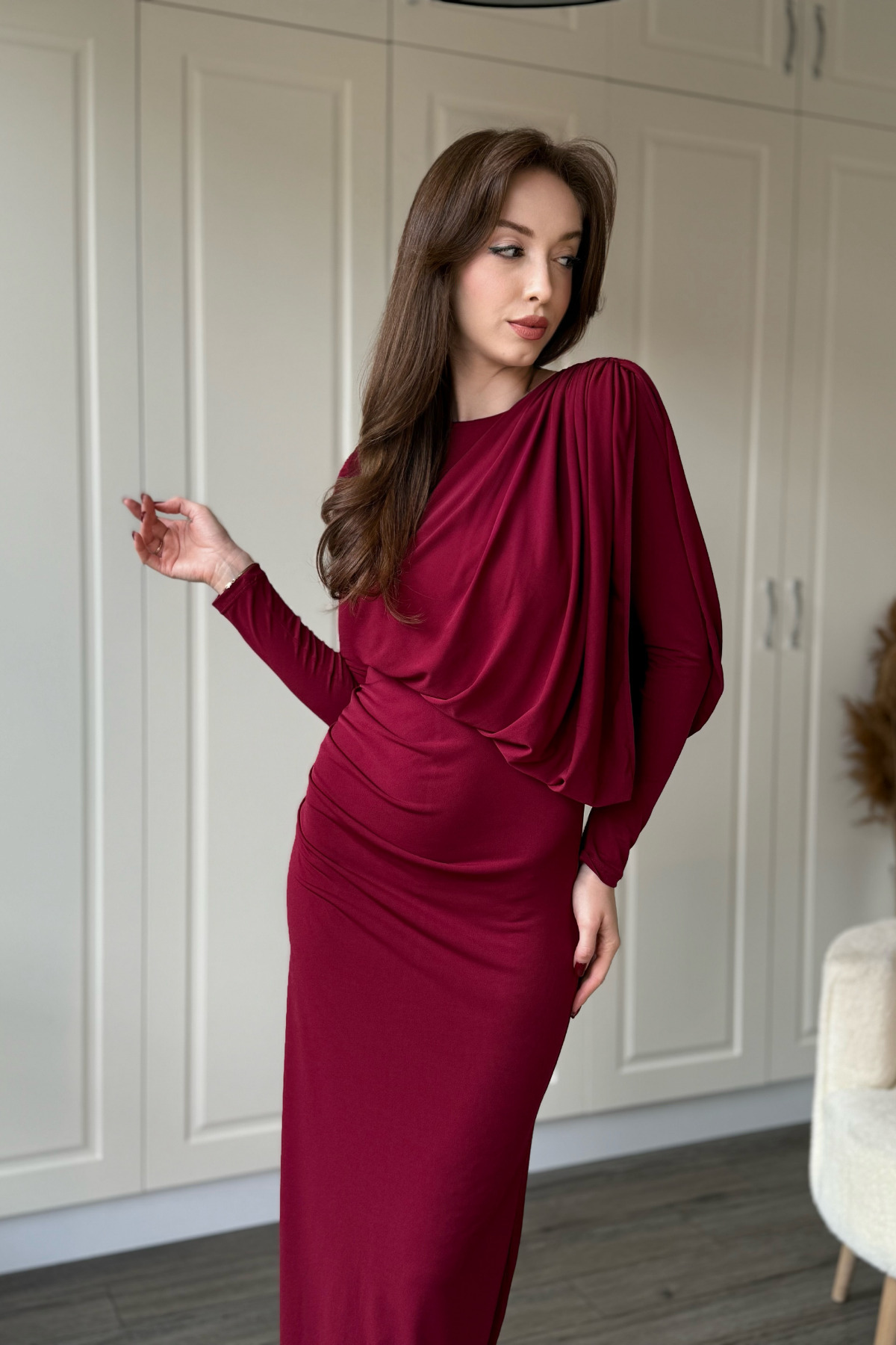 Uzun Kollu Boyunlu Zarif Dökümlü Bordo Elbise Uzun Kollu Boyunlu Zarif Dökümlü Bordo Elbise NovaOCT3 XL