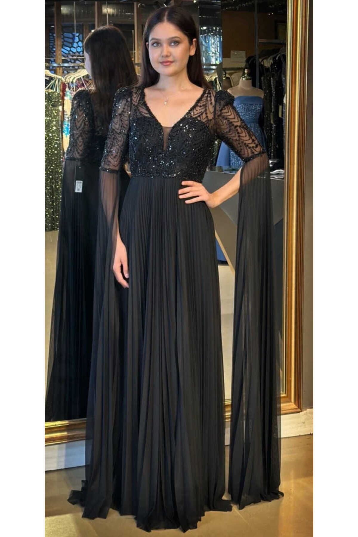 Siyah Yuvarlak Yaka Uzun Kollu Yırtmaçlı Düz Kesim Likralı Krep Uzun Abiye Elbise 11028-01 Siyah Yuvarlak Yaka Uzun Kollu Yırtmaçlı Düz Kesim Likralı Krep Uzun Abiye Elbise 11028-01 50
