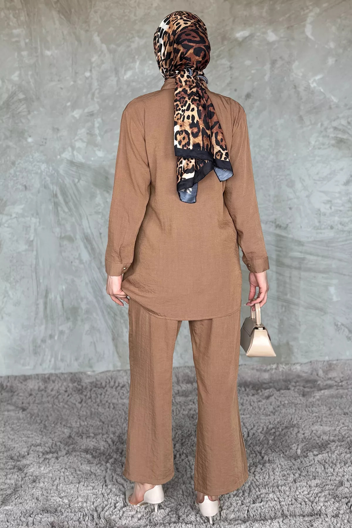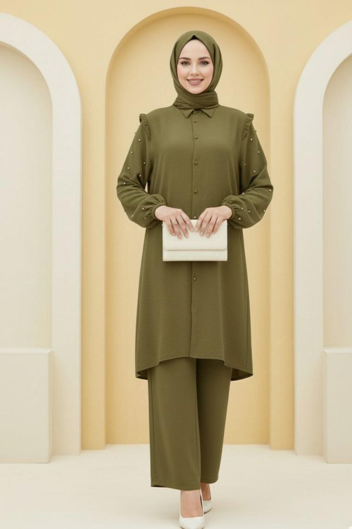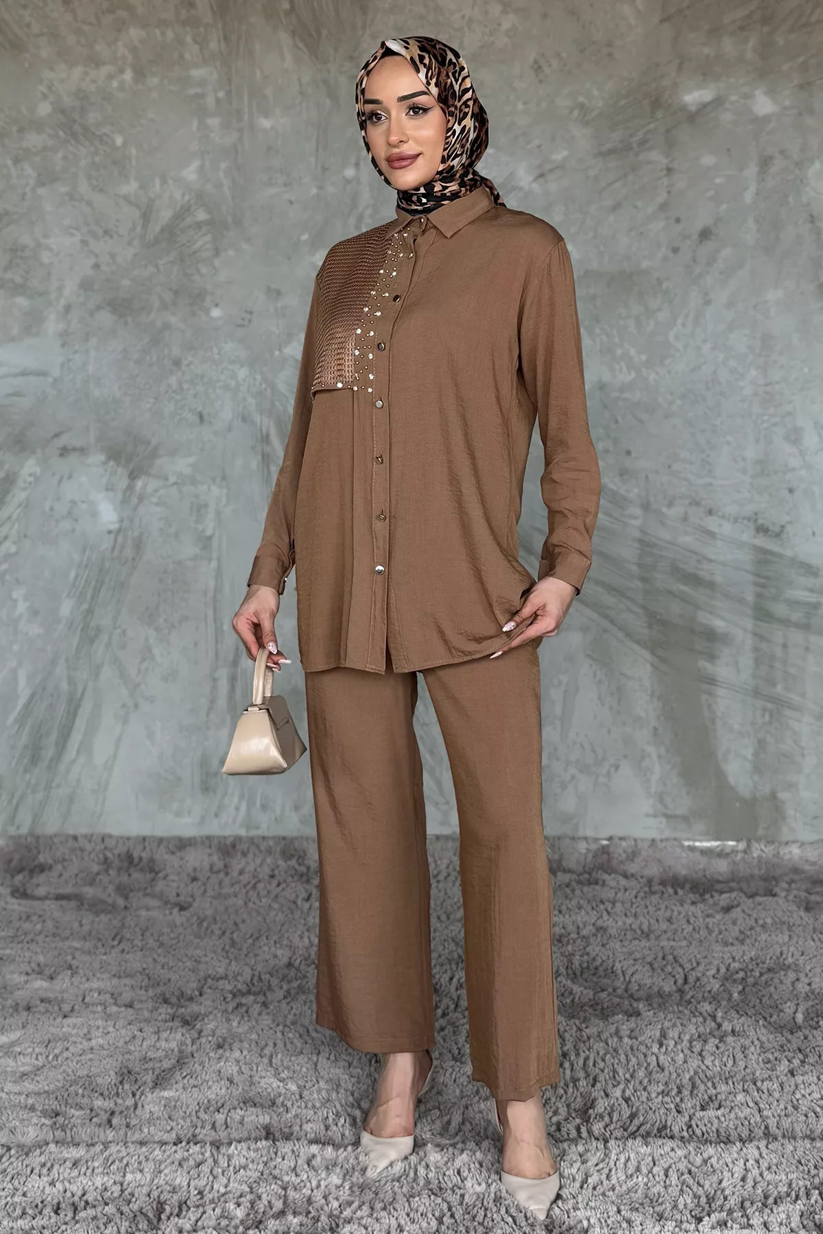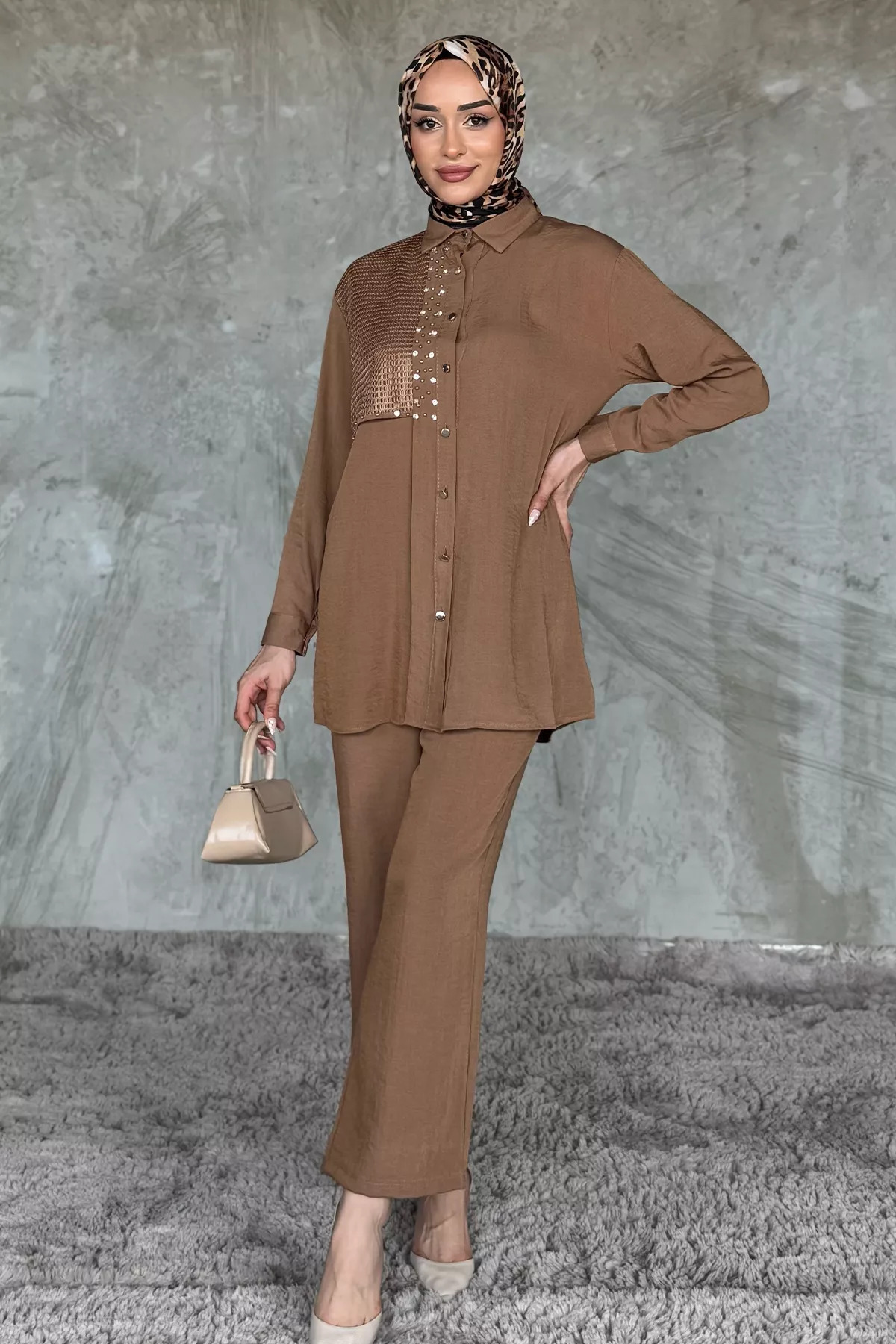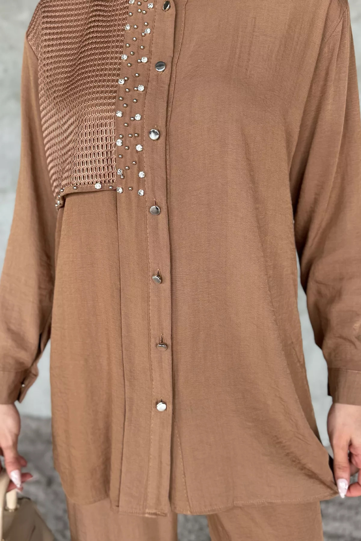 Bej Dantelli Taşlı Tesettür Tunik Pantolon İkili Takım Bej Dantelli Taşlı Tesettür Tunik Pantolon İkili Takım ZP-00017622 S