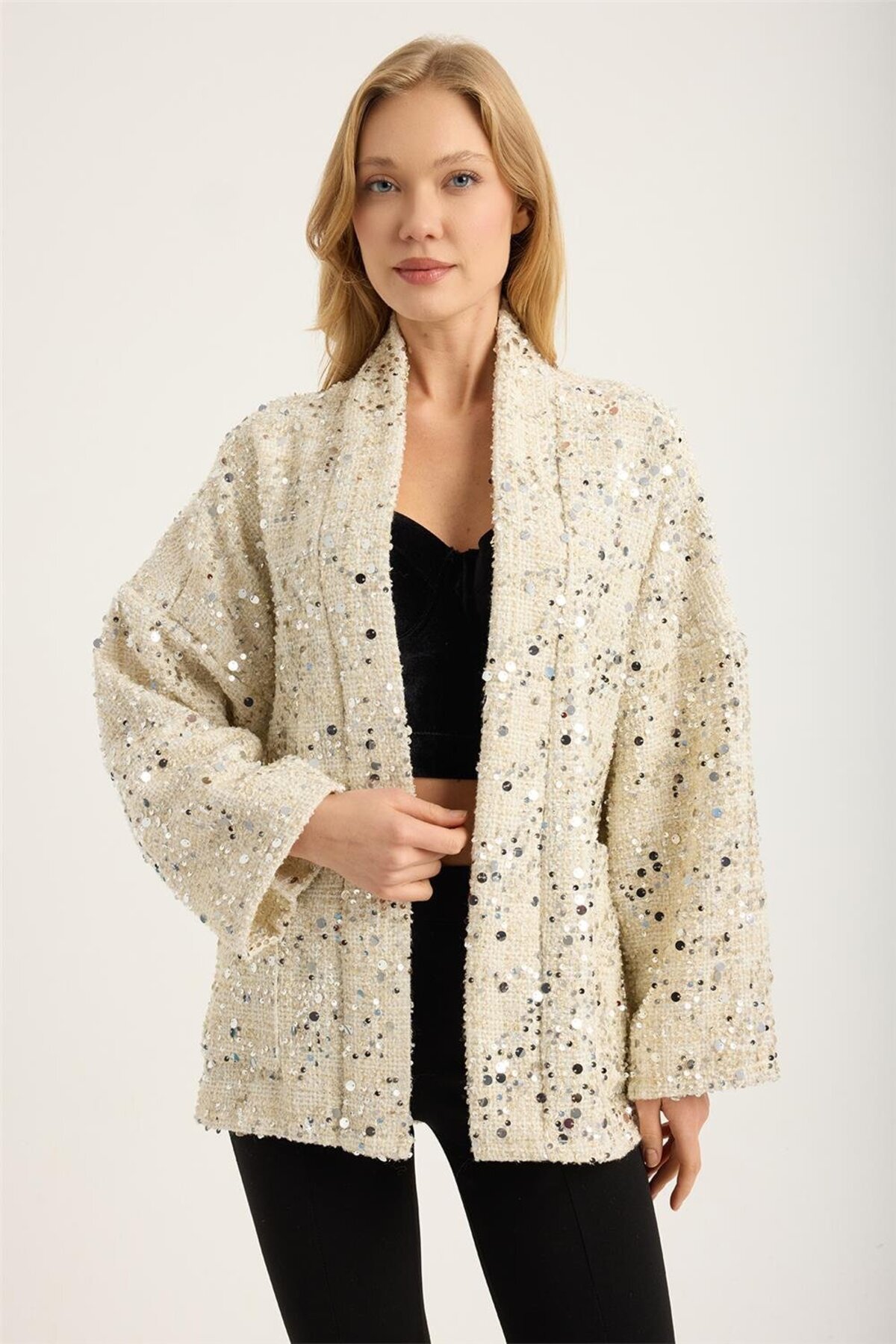 Krem Kadın Pul İşlemeli Yumoş İplik Triko Ceket Krem Kadın Pul İşlemeli Yumoş İplik Triko Ceket ZP-00018226 Standart