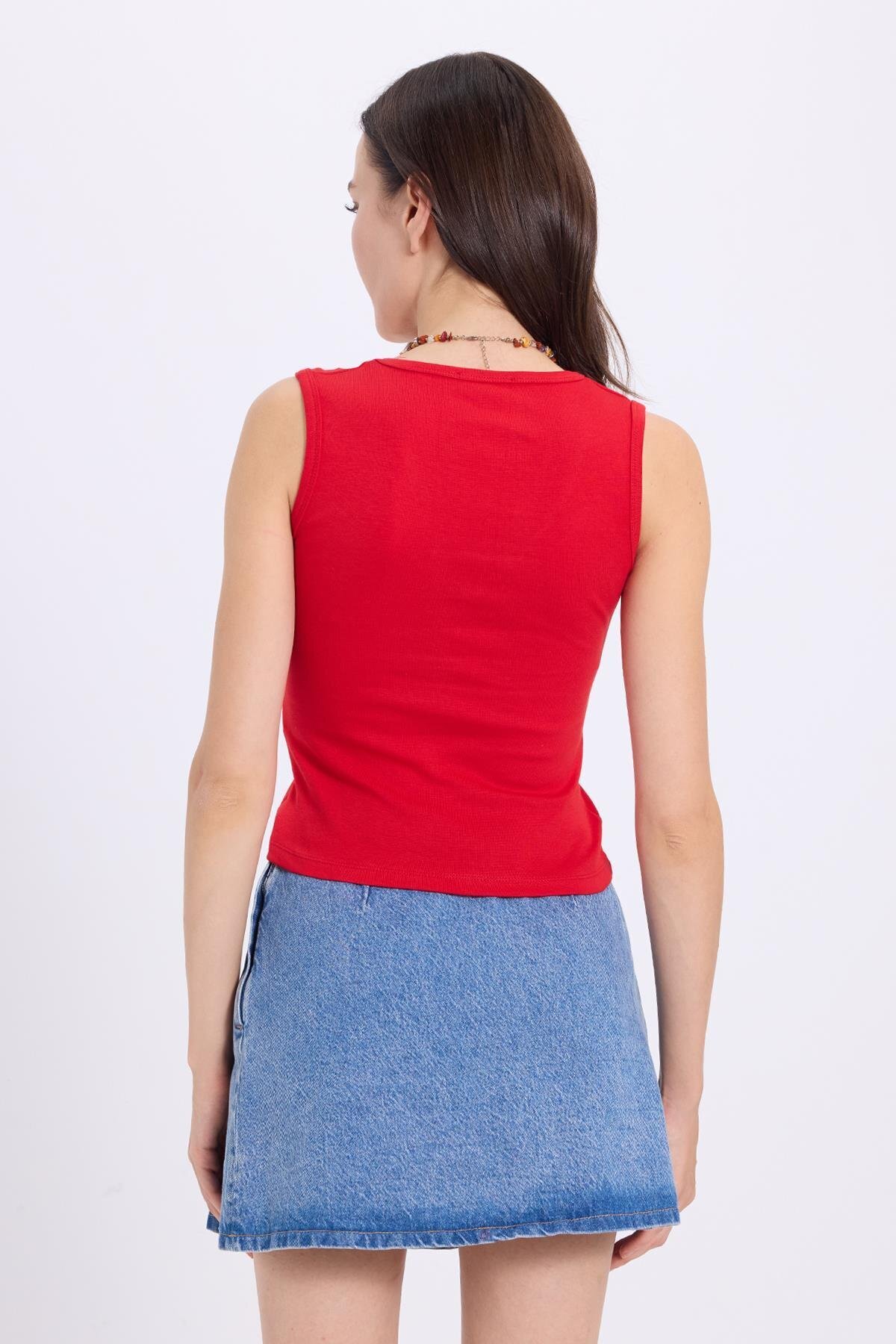 Kadın Slim Fit Dar Kesim V Yaka Sıfır Kol Pamuklu Ribanalı Kırmızı Bluz Kadın Slim Fit Dar Kesim V Yaka Sıfır Kol Pamuklu Ribanalı Kırmızı Bluz BYGM2558 XL