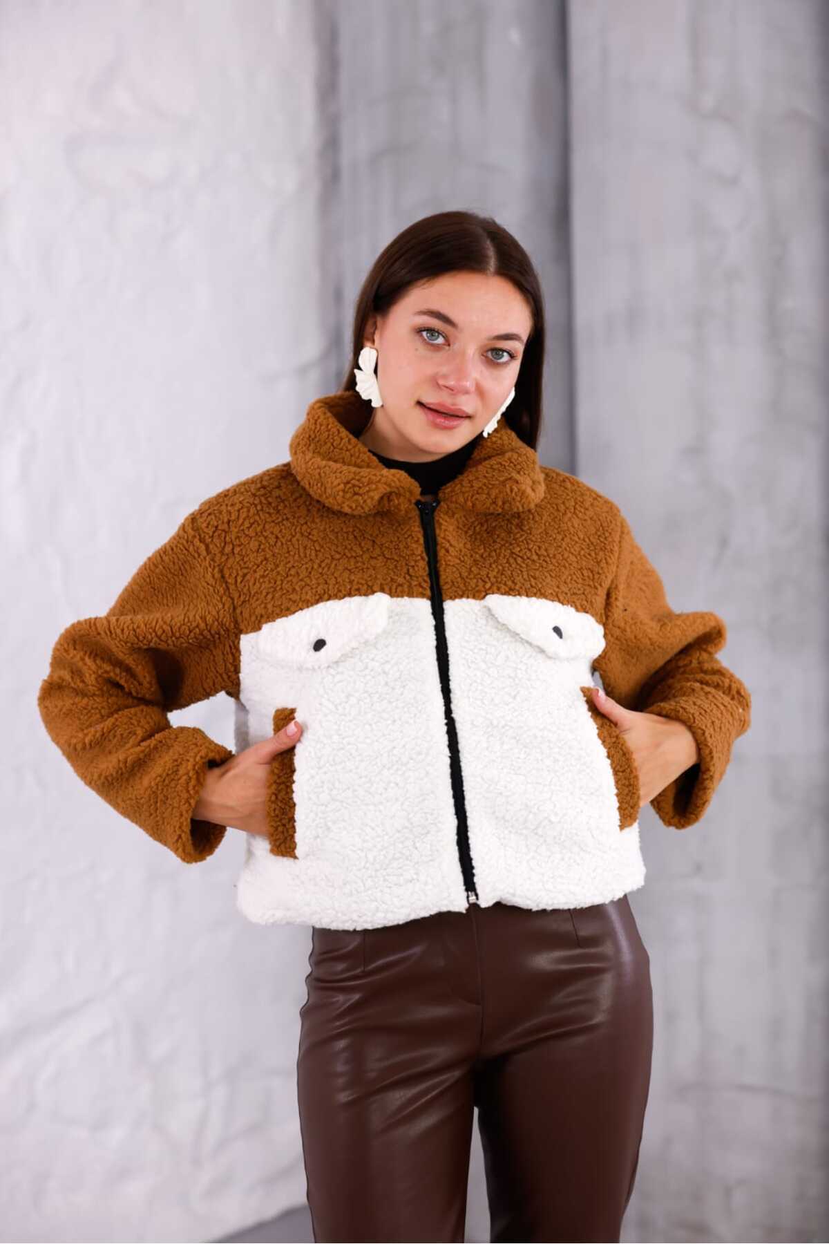 Trend Kadın Beyaz Kahve Peluş Ceket | Kışlık Crop Kısa Fermuarlı Yüksek Yaka Mont Trend Kadın Beyaz Kahve Peluş Ceket | Kışlık Crop Kısa Fermuarlı Yüksek Yaka Mont 005 L