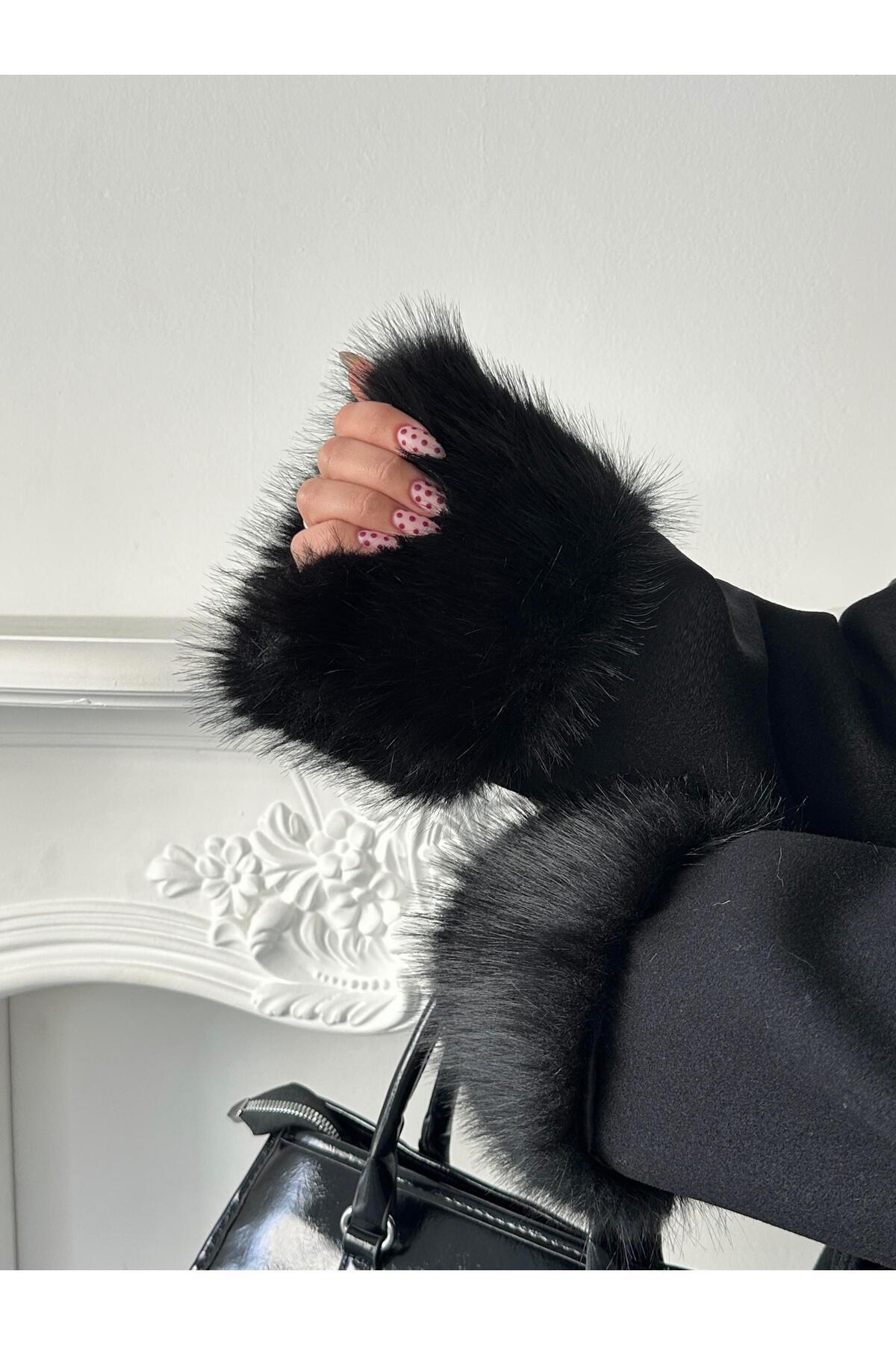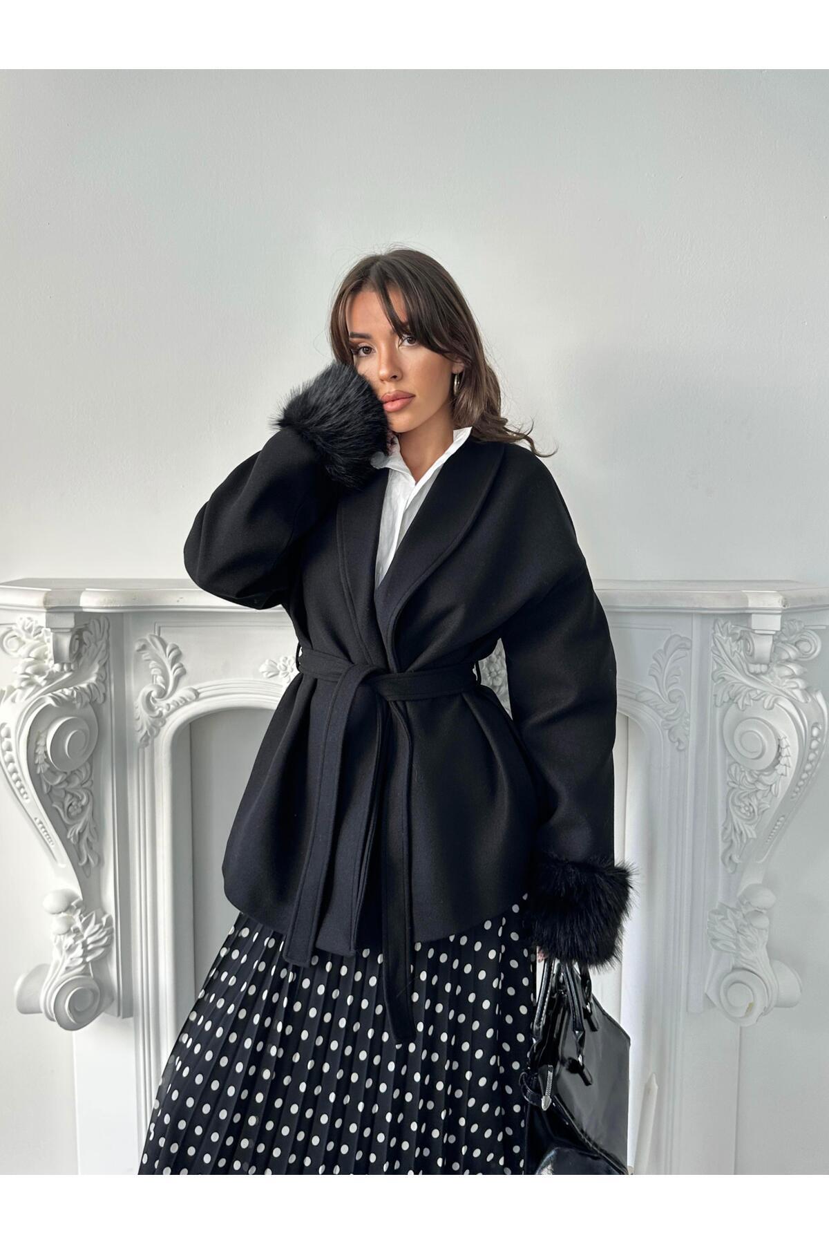 Kürklü Kol Detaylı Siyah Kaşe Kaban MLB091 Kürklü Kol Detaylı Siyah Kaşe Kaban MLB091 L
