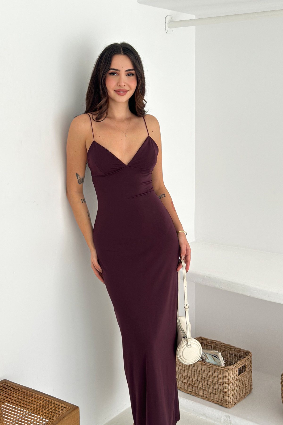 Kadın Mürdüm İp Askılı V Yaka Maxi Boy Elbise Kadın Mürdüm İp Askılı V Yaka Maxi Boy Elbise 1008 L