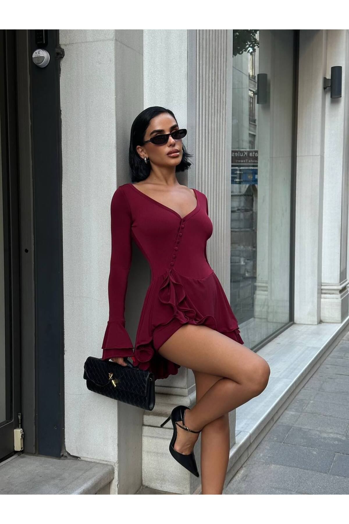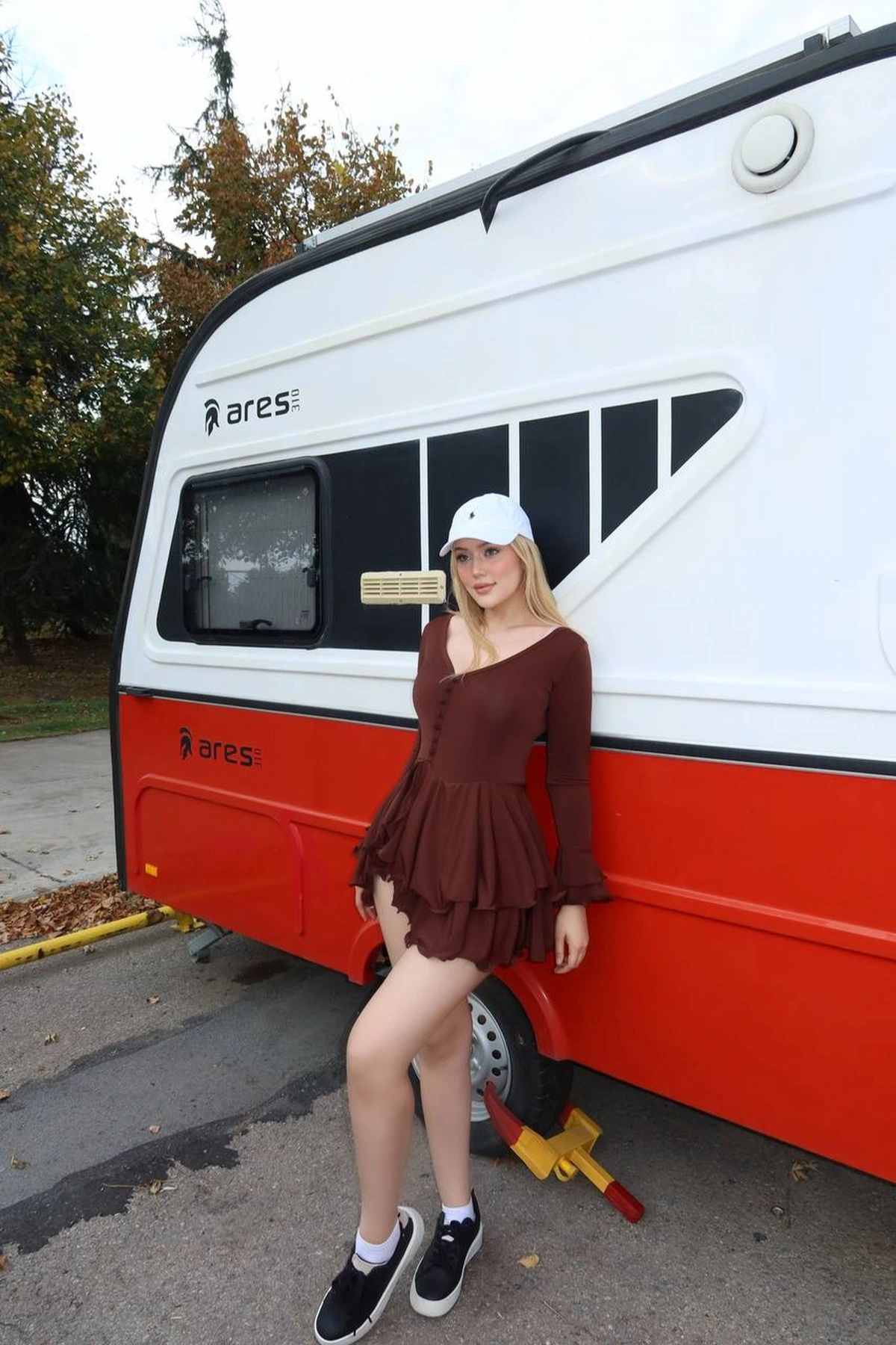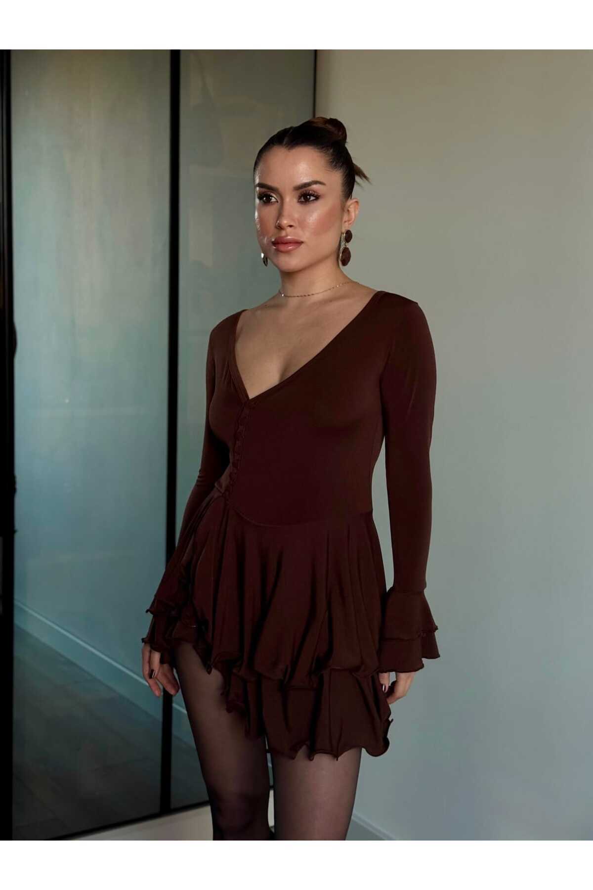 Şık Düğme Detaylı İspanyol Kol Şortlu Pileli Kahverengi Mini Elbise Şık Düğme Detaylı İspanyol Kol Şortlu Pileli Kahverengi Mini Elbise VK2025 L