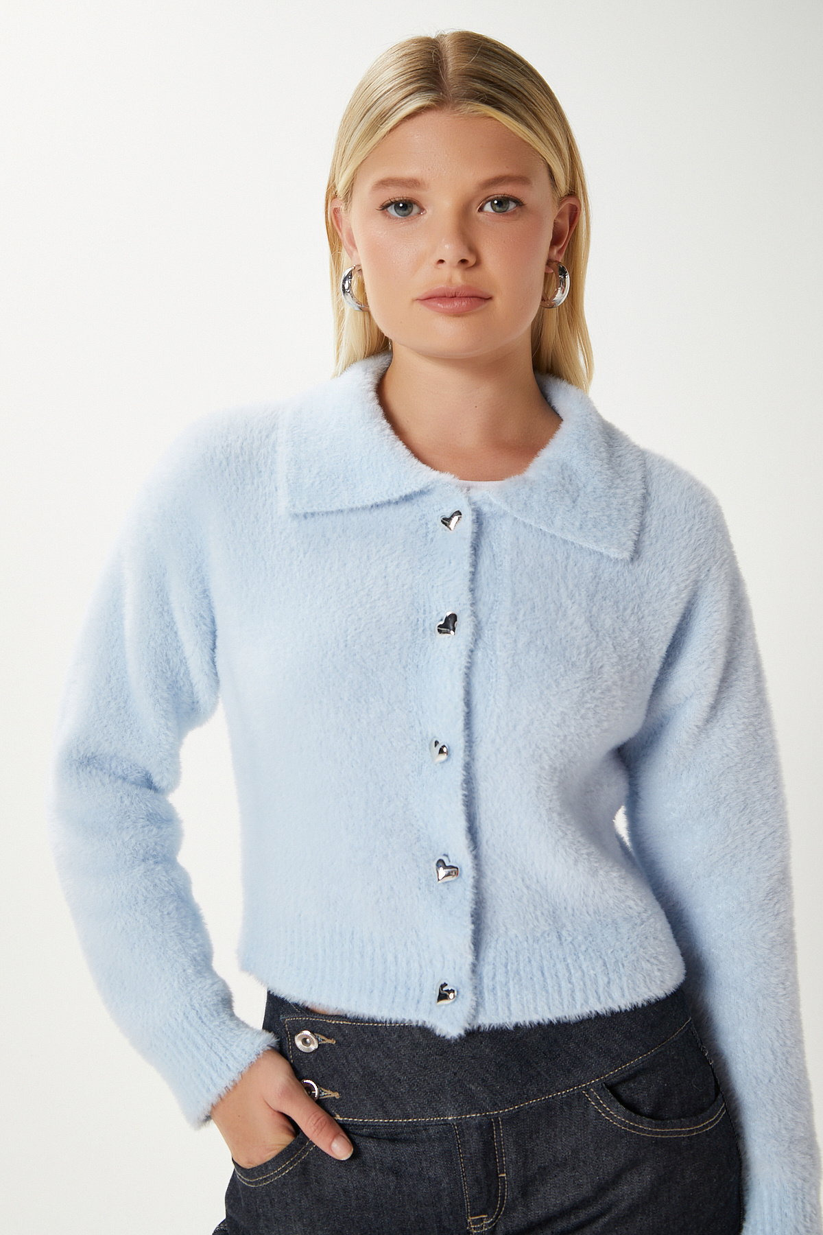 Kadın Date Yumuşak Sakallı Kalp Düğmeli Polo Yaka Gri Triko Hırka Kadın Date Yumuşak Sakallı Kalp Düğmeli Polo Yaka Gri Triko Hırka 1571 L