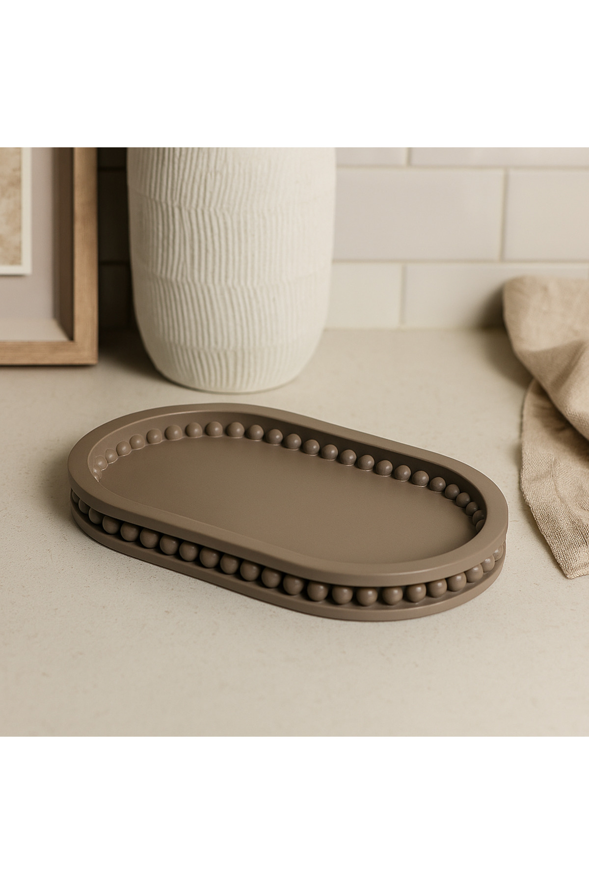 Modern Boncuk Kenarlı Dekoratif Tepsi – Taupe Modern Boncuk Kenarlı Dekoratif Tepsi – Taupe boncuktepsi تک سایز