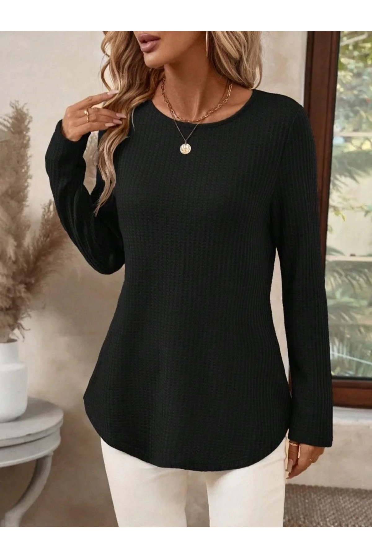 Kadın Siyah Sırtı Düğmeli Bisiklet Yaka Uzun Kollu Oval Etek Uçlu Waffle Kumaş Bluz Tunik Kadın Siyah Sırtı Düğmeli Bisiklet Yaka Uzun Kollu Oval Etek Uçlu Waffle Kumaş Bluz Tunik P11262S8741 2XL-3XL
