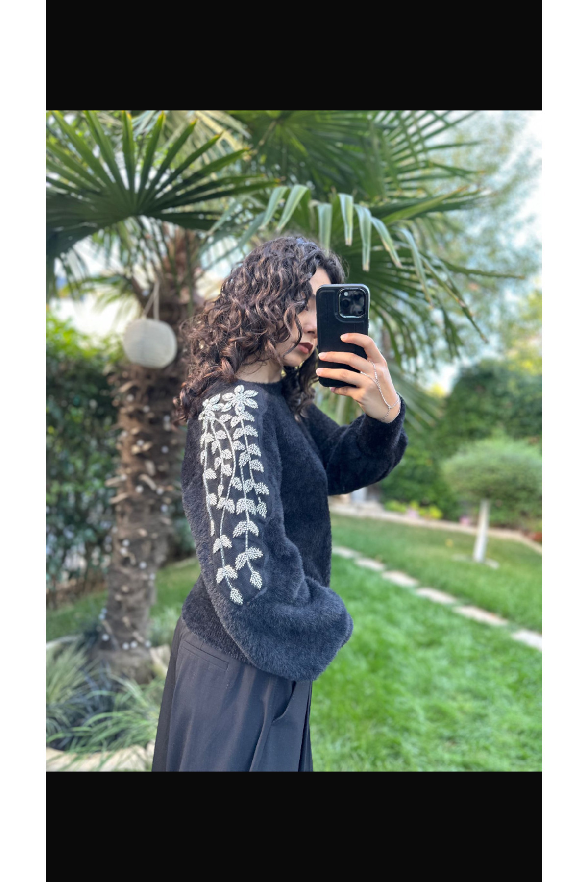 Payet ve Boncuk İşlemeli Kol Detaylı Sakallı Triko Kazak Payet ve Boncuk İşlemeli Kol Detaylı Sakallı Triko Kazak WİE23551 Standart