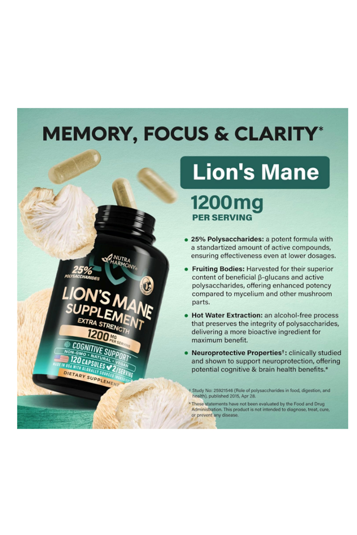 NUTRAHARMONY Organic Lions Mane - Made in USA 1200 mg Memory & Focus Support 120 Capsules. NUTRAHARMONY Organic Lions Mane - Made in USA 1200 mg Memory & Focus Support 120 Capsules. NTYLMNCV41 تک سایز