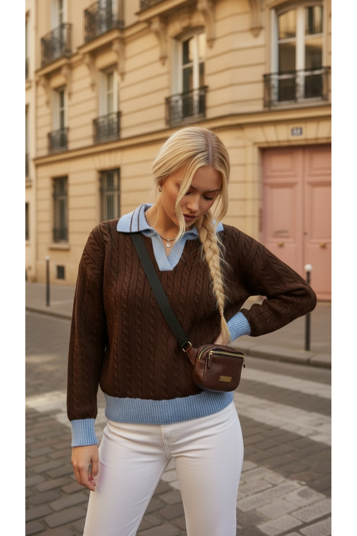 Kahverengi Çizgili Polo Yaka Kadın Triko Kazak Kahverengi Çizgili Polo Yaka Kadın Triko Kazak nlzkahvecizgi Standart