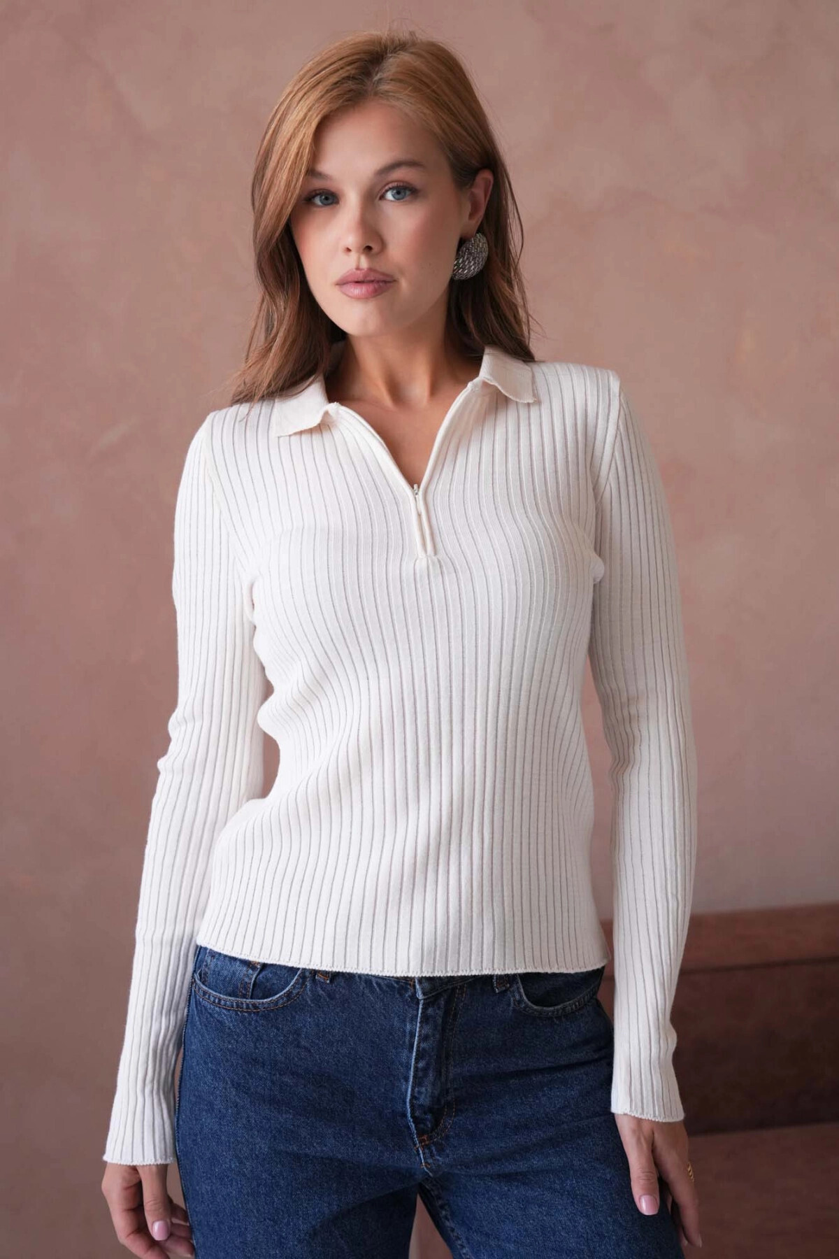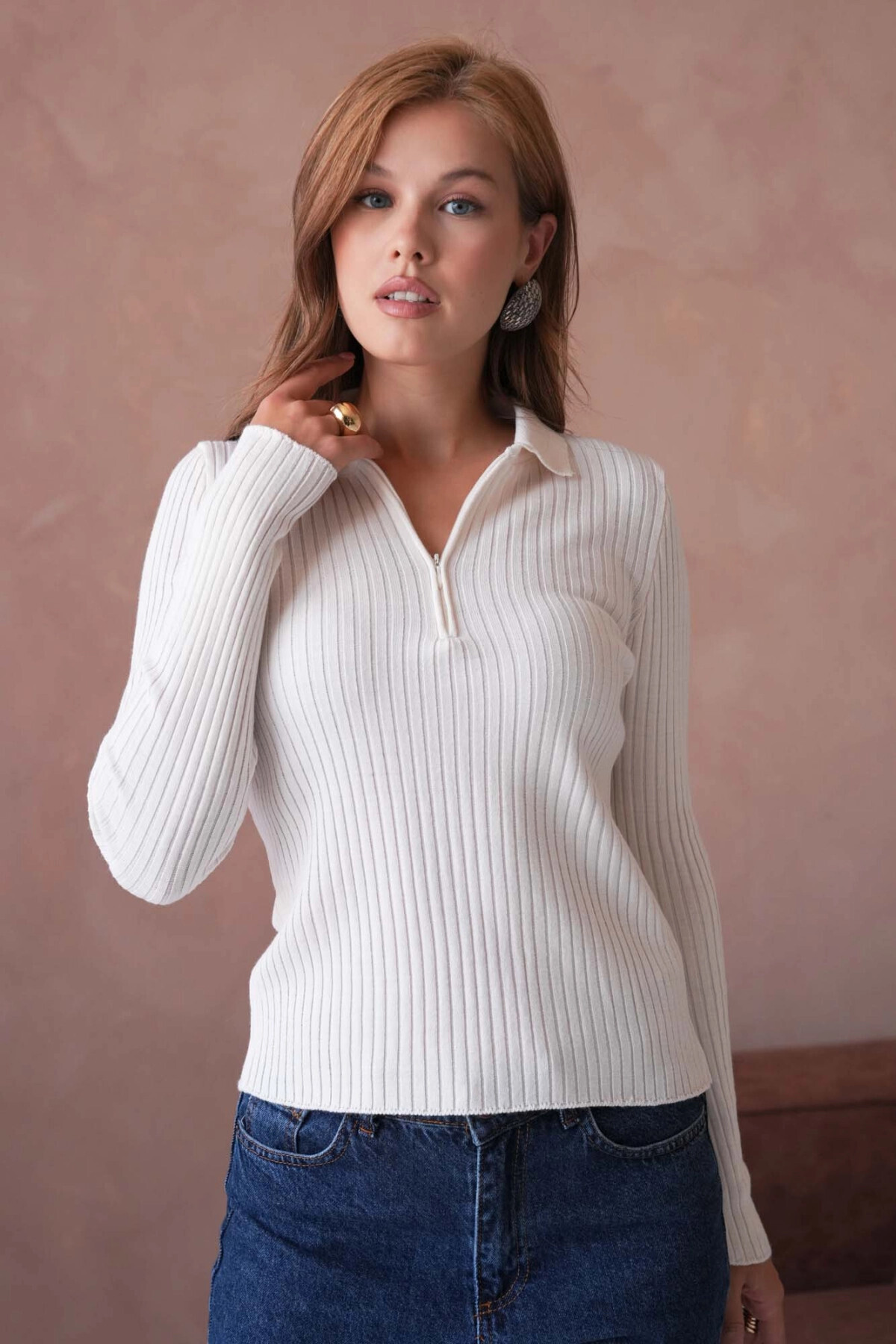 Kadın Polo Yaka Fermuar Detay Kaşkorse Triko Kazak Kadın Polo Yaka Fermuar Detay Kaşkorse Triko Kazak 12226 Standart