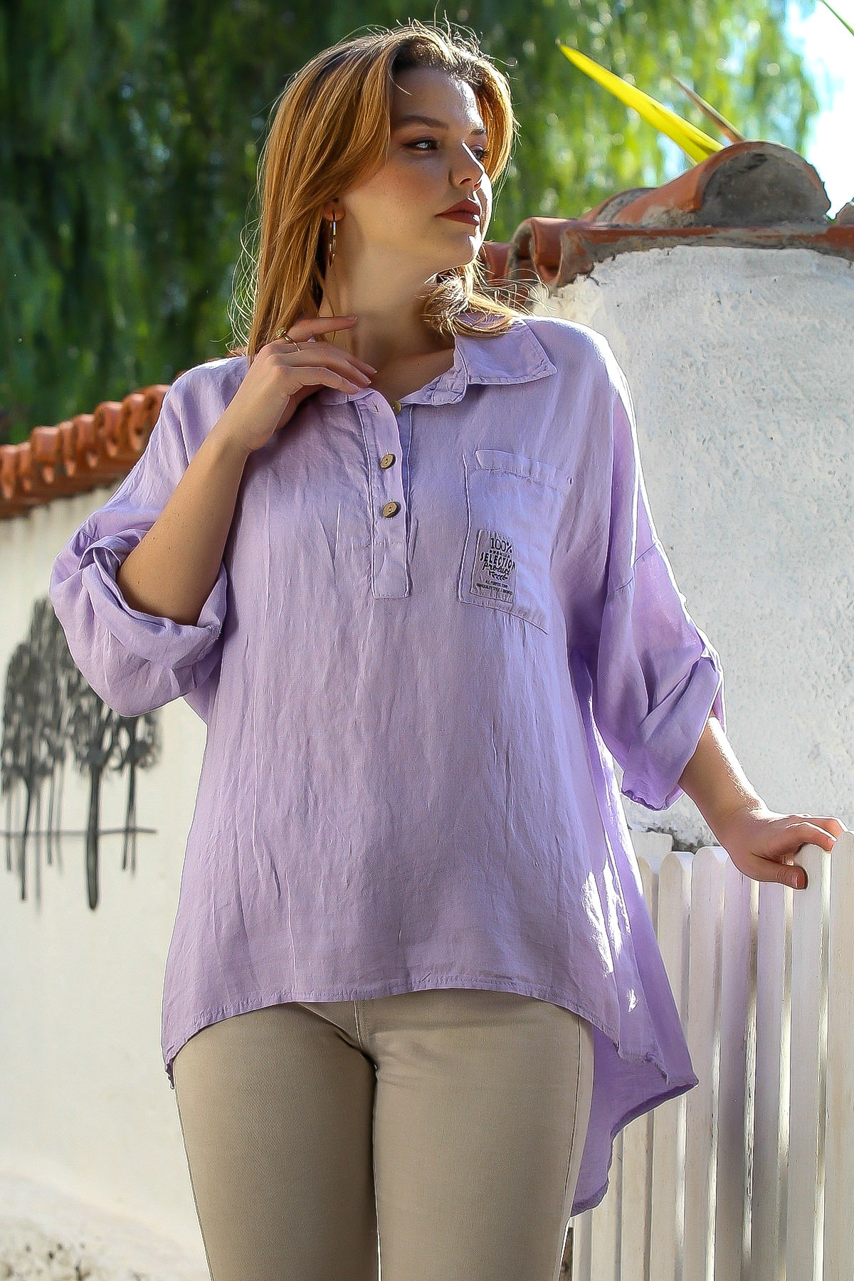 İtalyan Lila Gömlek Yaka Düğmeli Uzun Kollu Cepli Keten Arkası Uzun Oversize Dokuma Bluz 75 70 İtalyan Lila Gömlek Yaka Düğmeli Uzun Kollu Cepli Keten Arkası Uzun Oversize Dokuma Bluz 75 70 M10010200BL91062 Standart