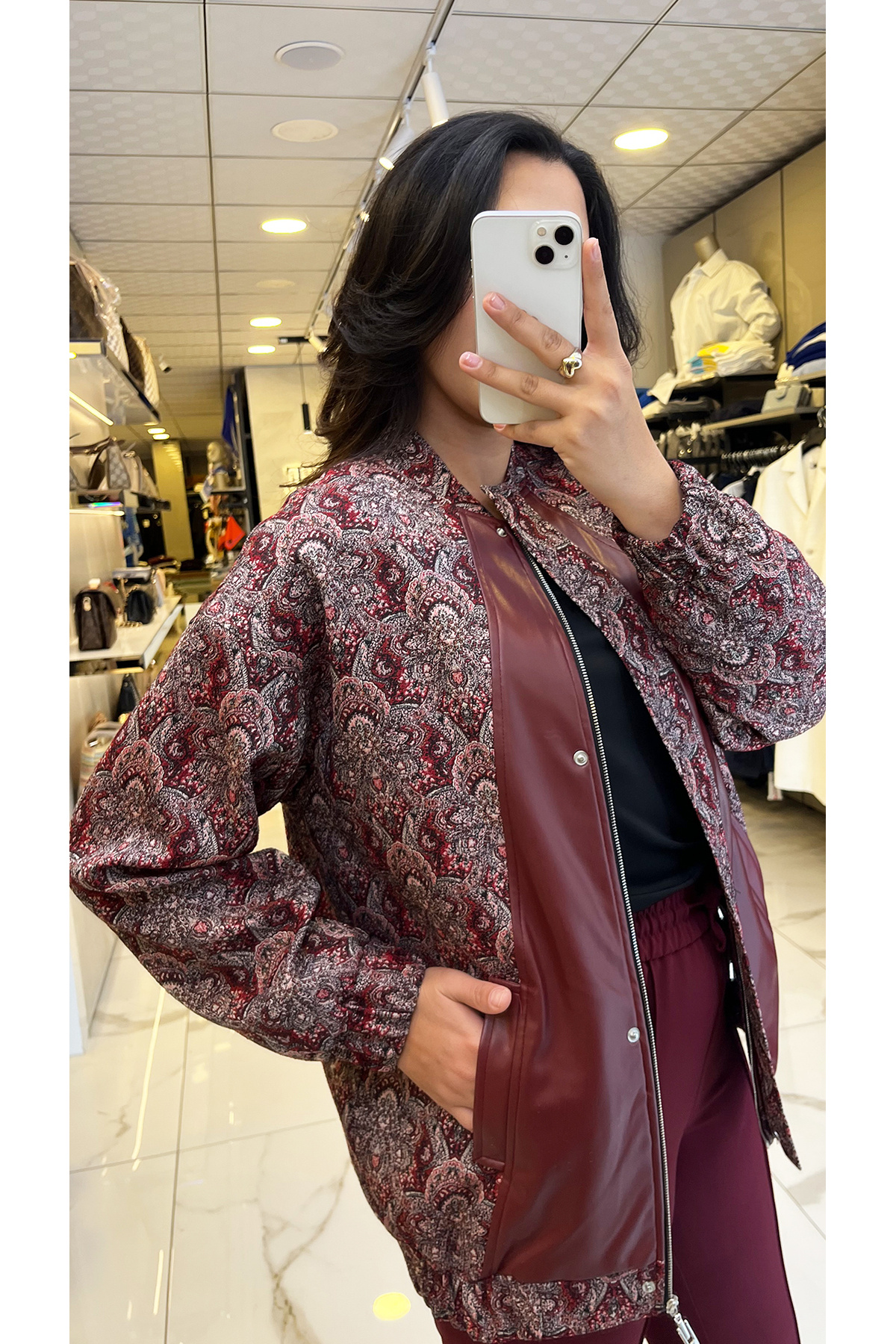 Moda İlgi Bordo Desenli Deri Detaylı Bomber Ceket Moda İlgi Bordo Desenli Deri Detaylı Bomber Ceket 70102BRD 42