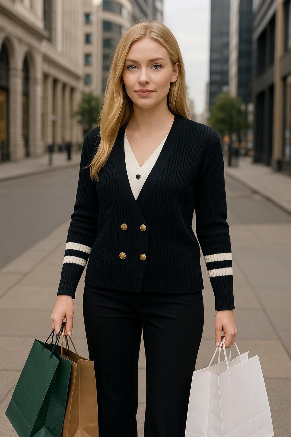Kadın Gold Düğmeli V Yaka Fitili Kolu Şerit Detaylı Kazak-Hırka Kadın Gold Düğmeli V Yaka Fitili Kolu Şerit Detaylı Kazak-Hırka yuğ01 Standart