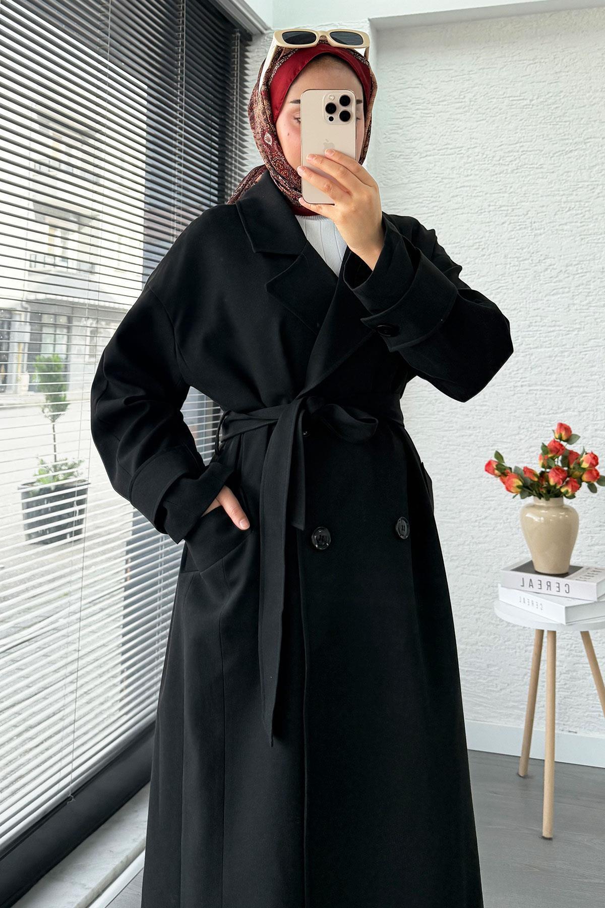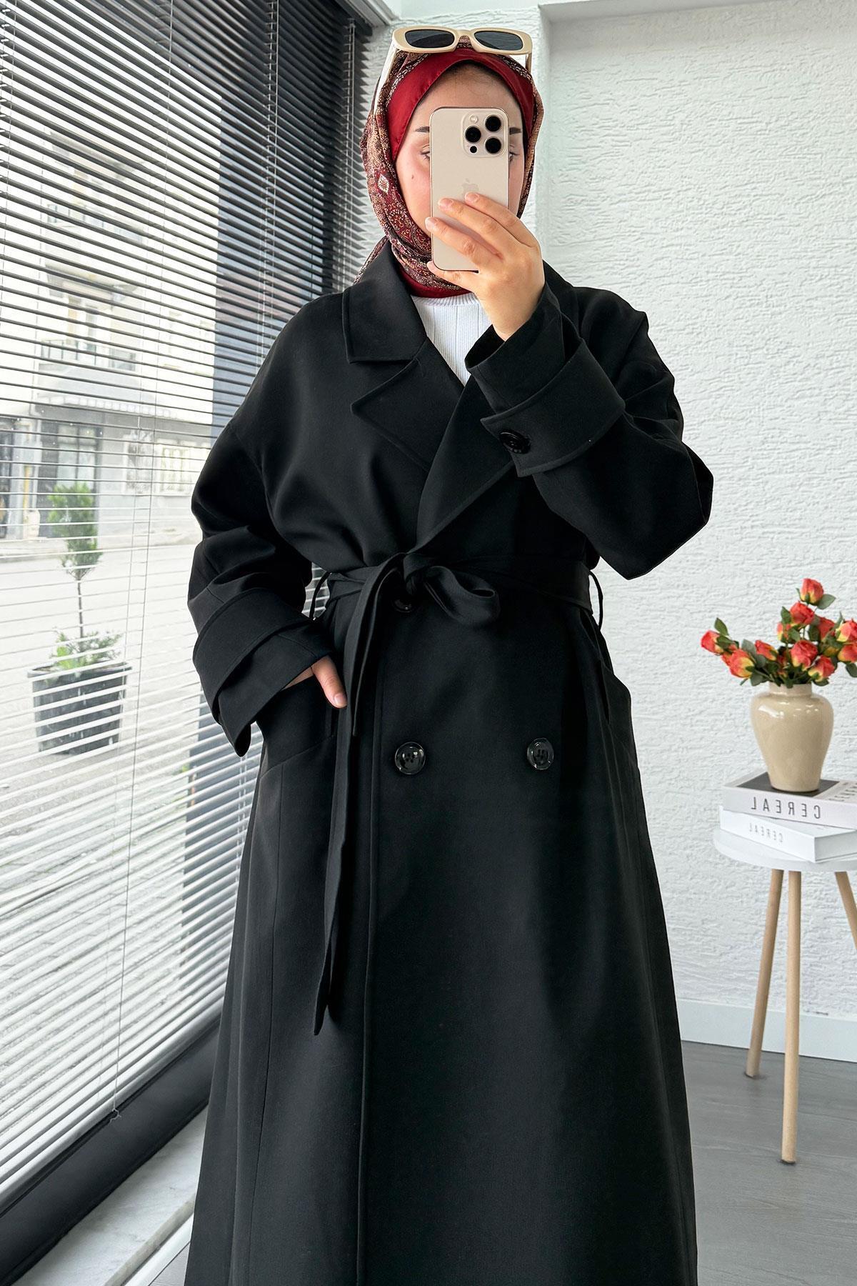 Premium Cepli Oversize Kadın Trençkot – Siyah Premium Cepli Oversize Kadın Trençkot – Siyah mlk15652 Standart
