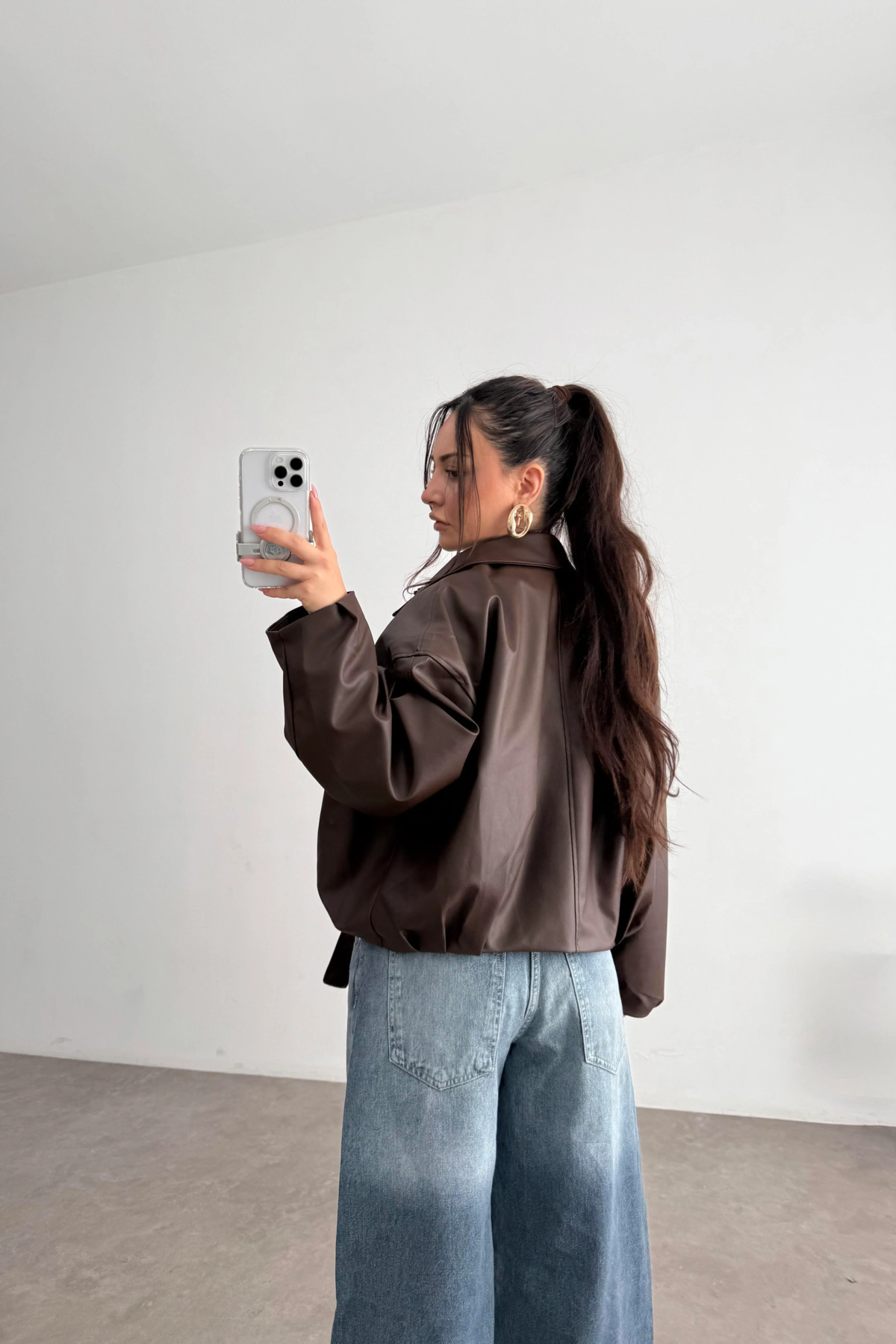 Kadın Oversize Bomber Premium Deri Ceket Kemerli Kadın Oversize Bomber Premium Deri Ceket Kemerli pop-221356868456 L