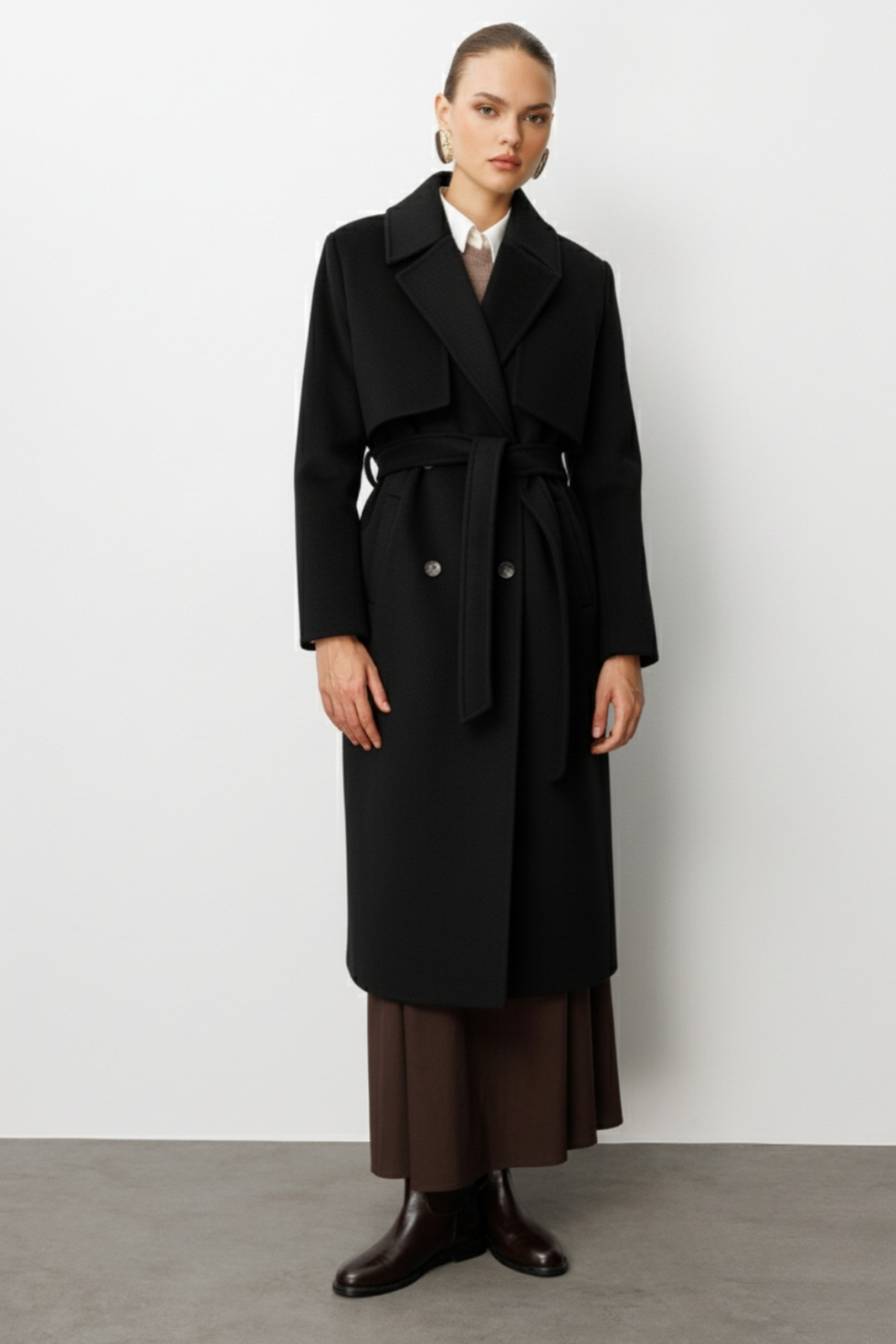 Yünlü Kaşe Dokulu Mürdüm Rengi Uzun Trençkot Kaban Yünlü Kaşe Dokulu Mürdüm Rengi Uzun Trençkot Kaban M1MZ1020110071 XL