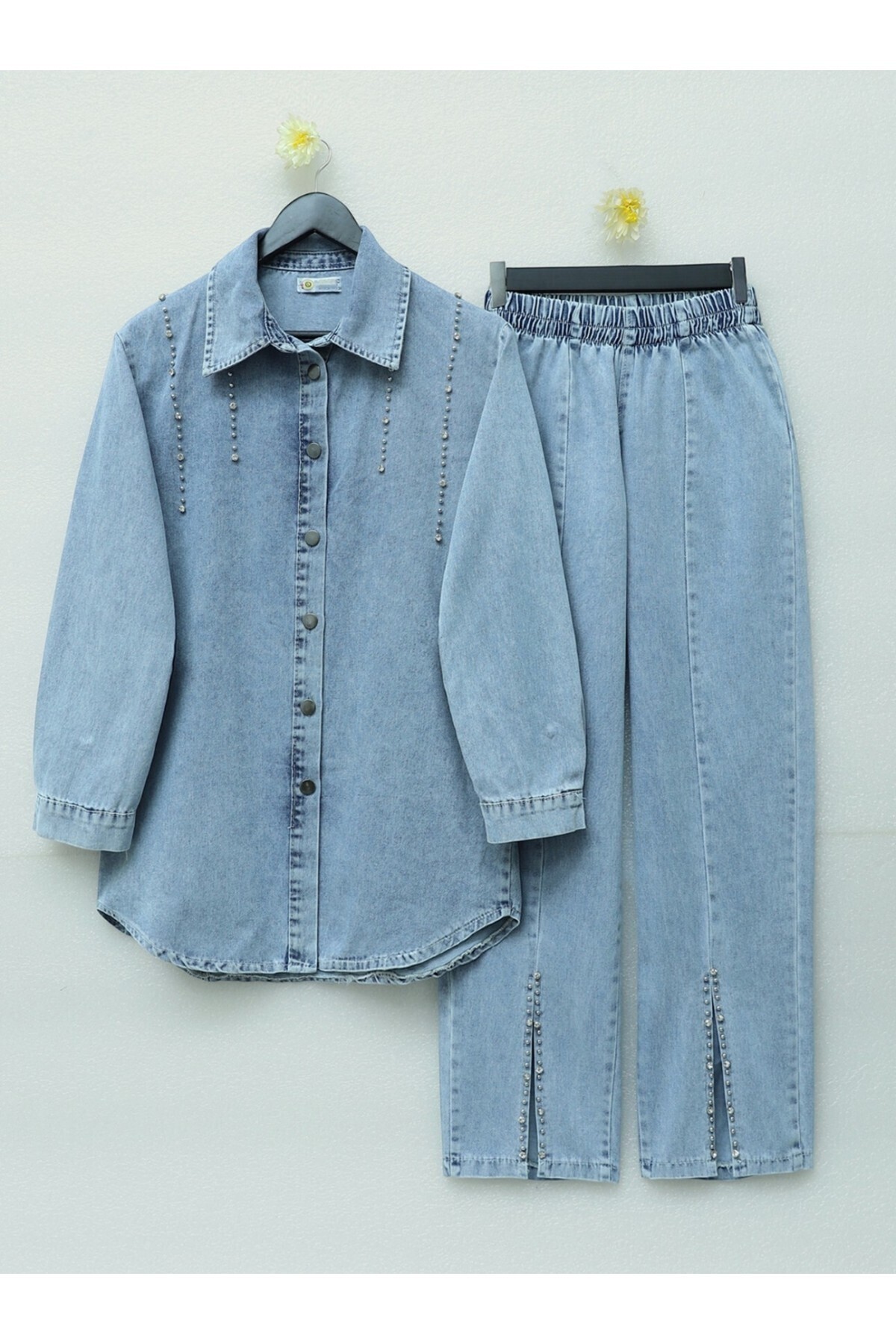Paçası Yırtmaçlı Taş Detaylı İkili Kot Takım Paçası Yırtmaçlı Taş Detaylı İkili Kot Takım MR418972290 42