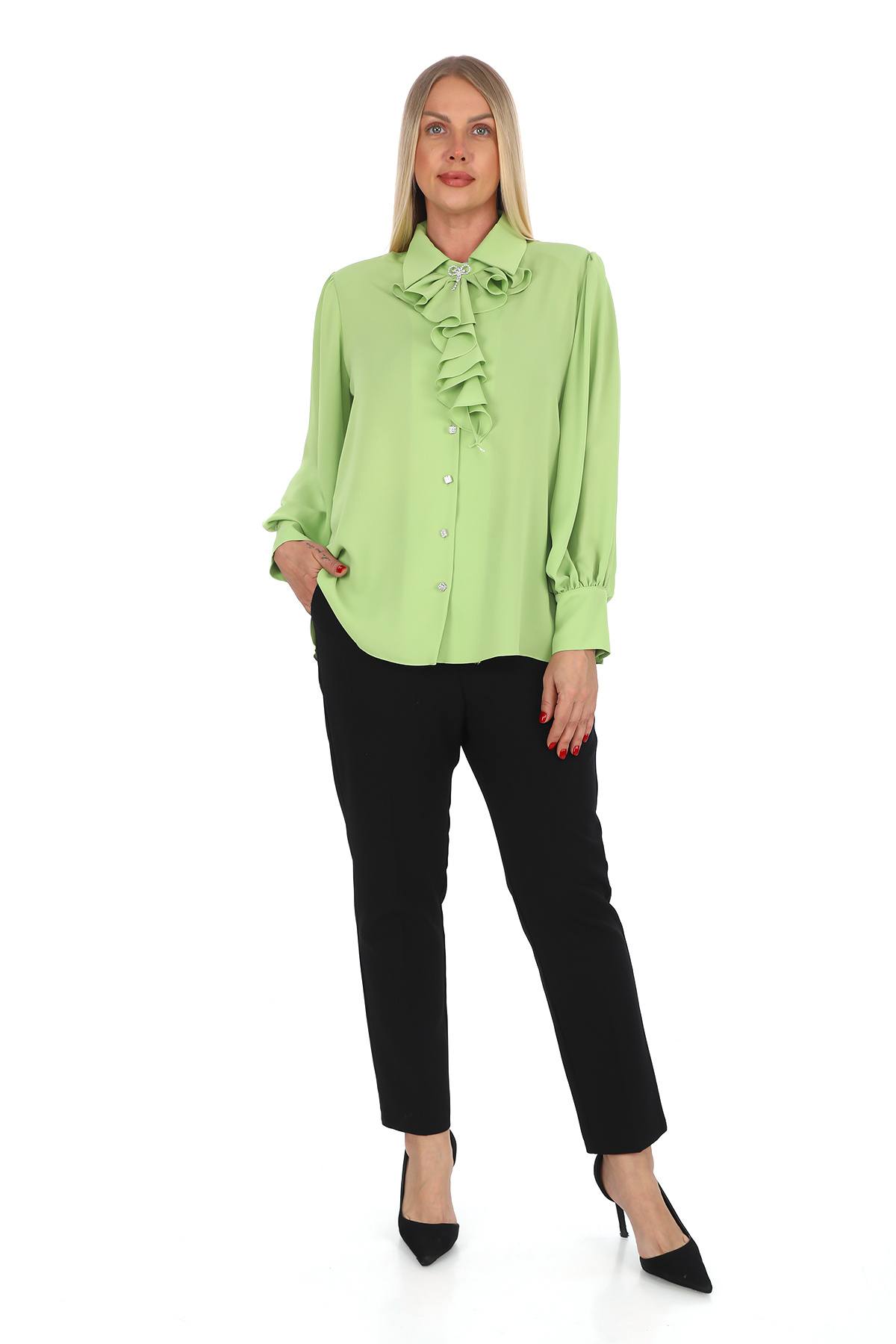 Büyük Beden Apoletli Kol Taşlı Düğme Fırfır Yaka Broş Detaylı Şık Kadın Bluz Büyük Beden Apoletli Kol Taşlı Düğme Fırfır Yaka Broş Detaylı Şık Kadın Bluz W25.17170-01 48