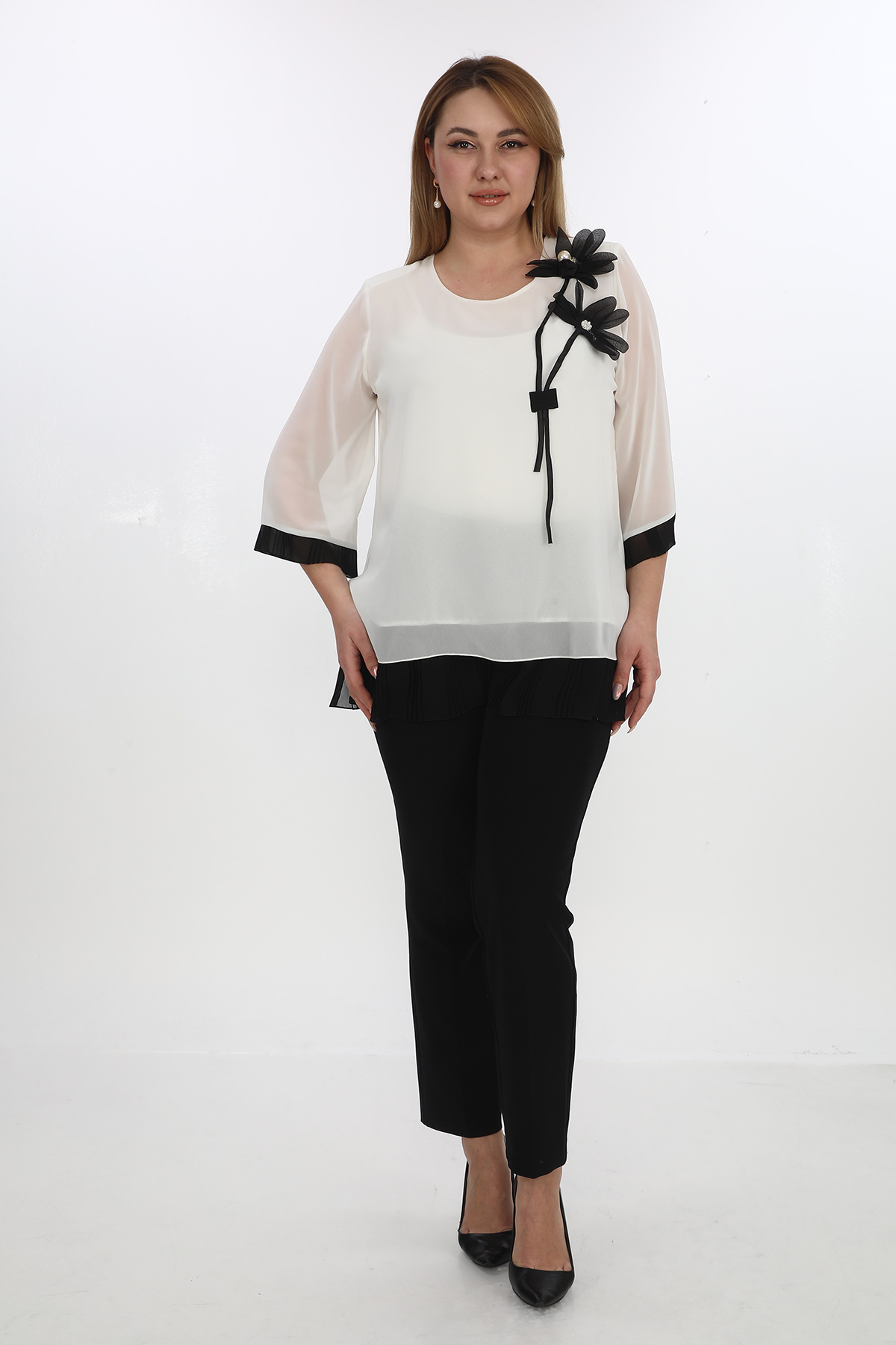 Büyük Beden İki Kat Şifon Plise Detaylı 3D Çiçek Aksesuarlı Şık Kadın Bluz Büyük Beden İki Kat Şifon Plise Detaylı 3D Çiçek Aksesuarlı Şık Kadın Bluz S25.18033-20 42