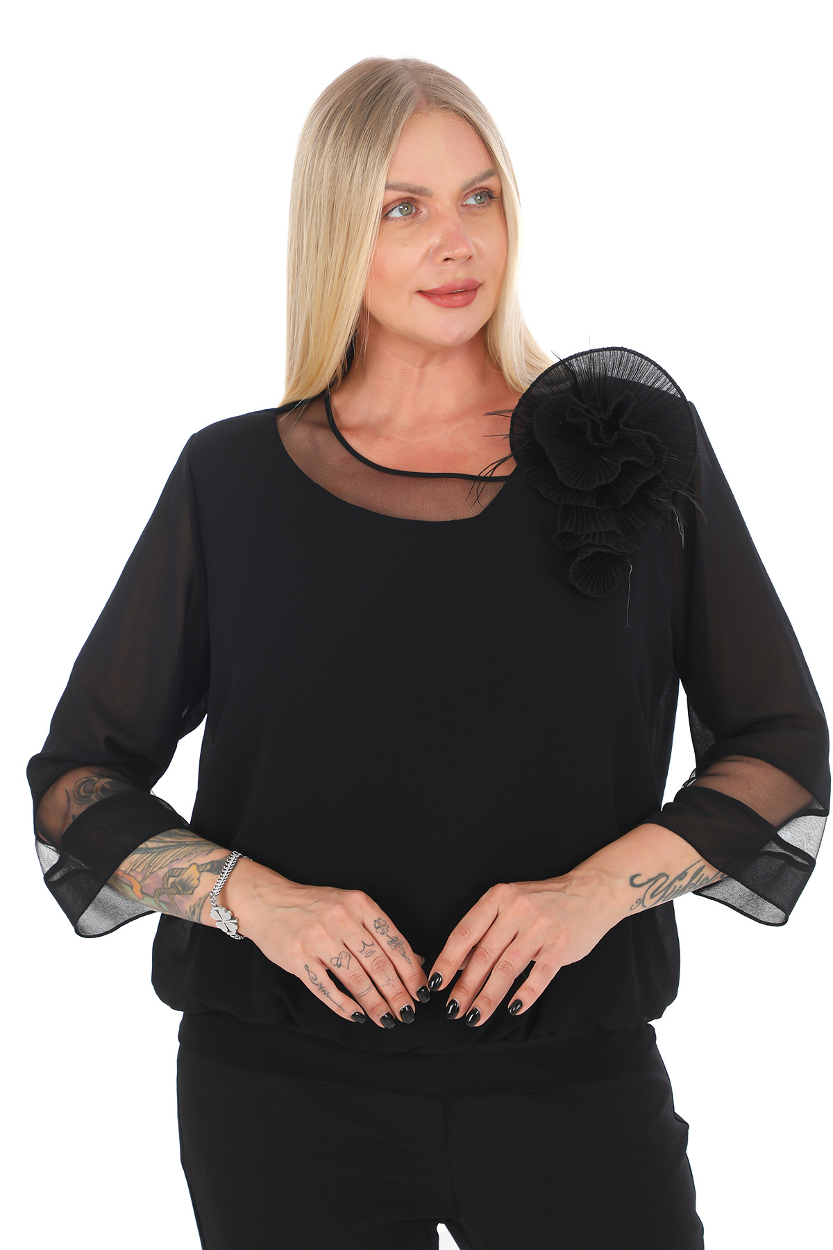 Büyük Beden (50-56) Sandy Şifon Tül Yaka 3D Çiçek Aksesuar Beli Lastikli Şık Kadın Bluz Büyük Beden (50-56) Sandy Şifon Tül Yaka 3D Çiçek Aksesuar Beli Lastikli Şık Kadın Bluz W25.22746-01 56