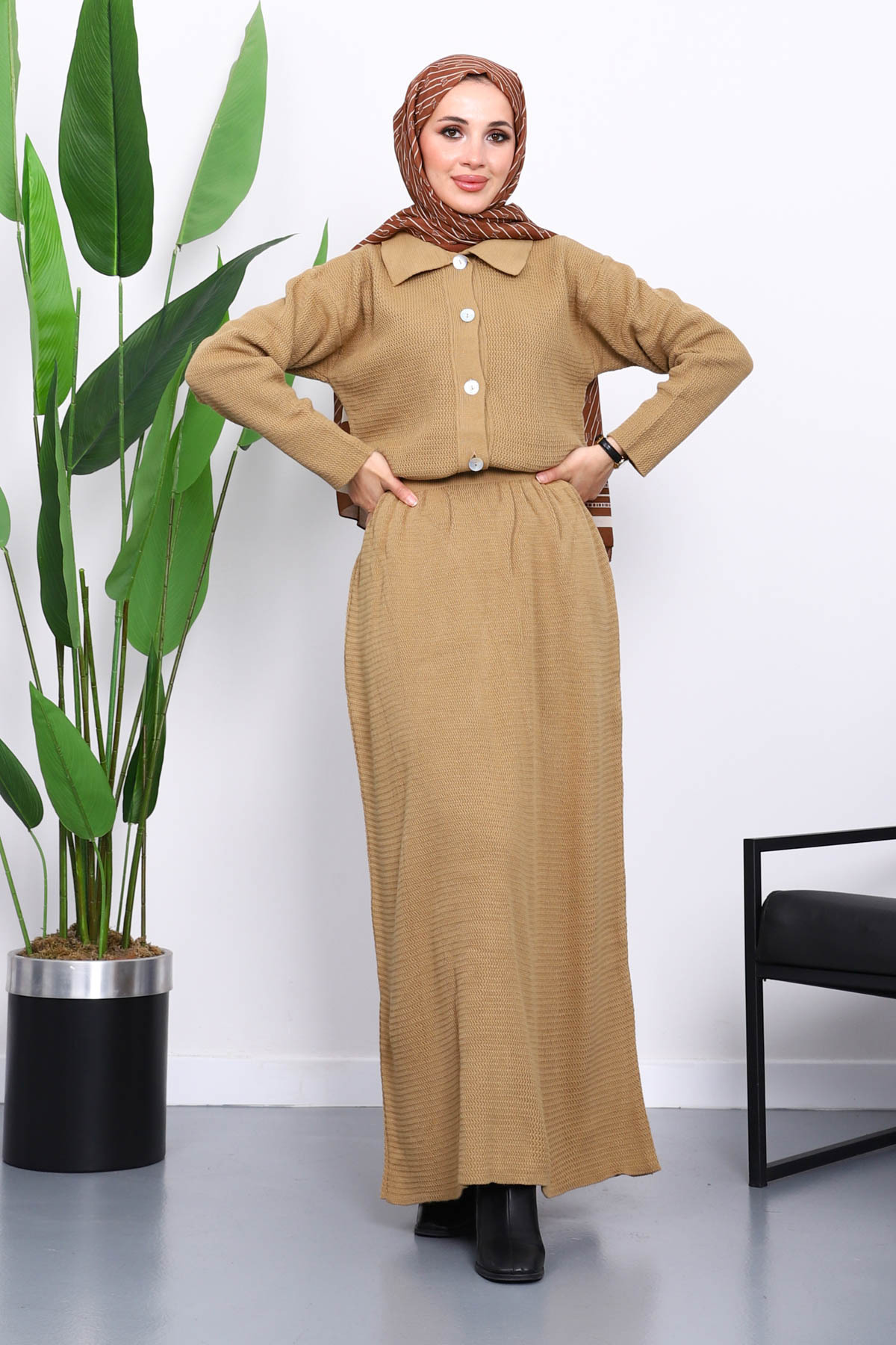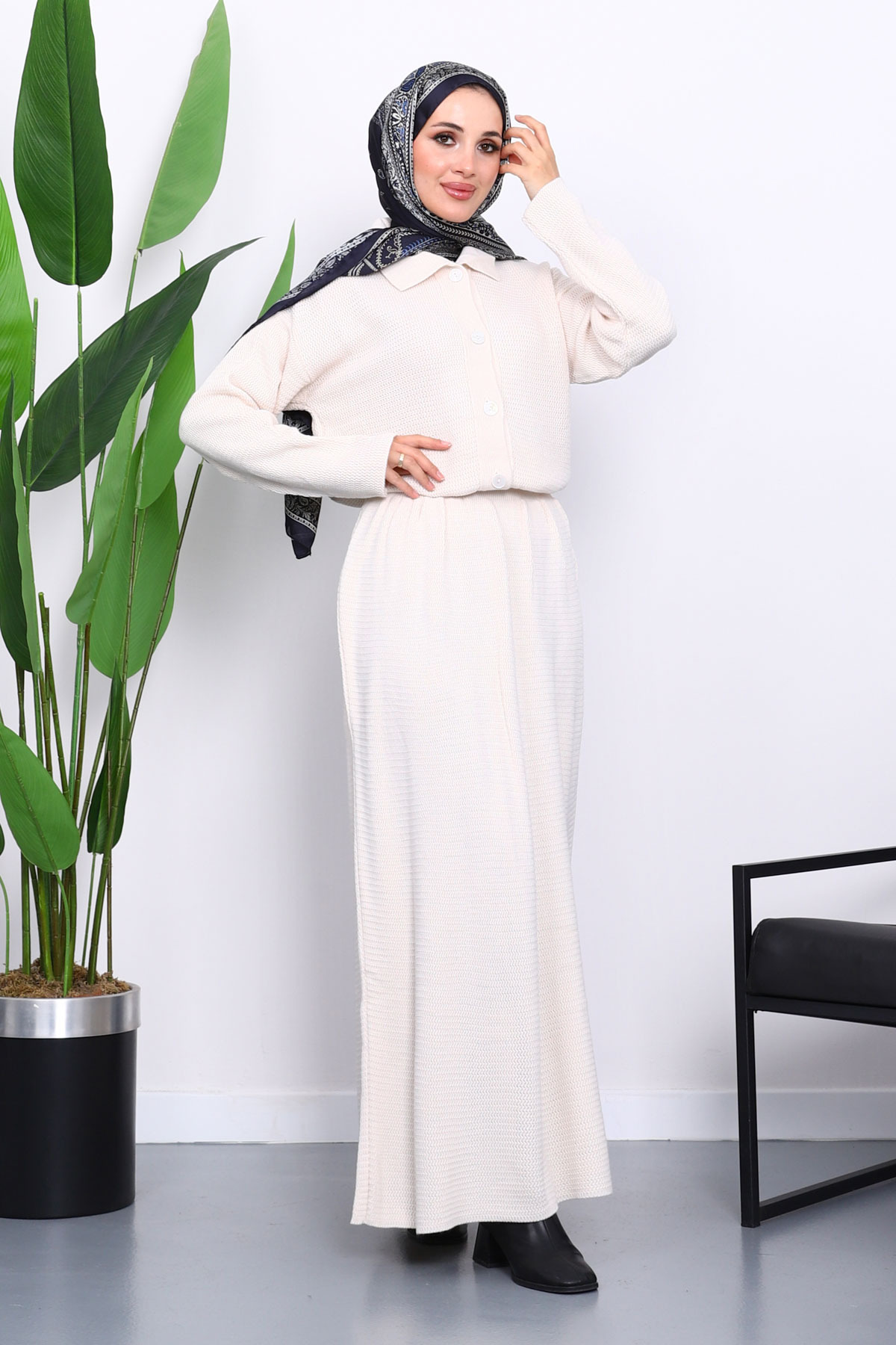 Krem Gömlek Yaka Düğmeli Triko Etekli Takım Krem Gömlek Yaka Düğmeli Triko Etekli Takım IMJ008349 تک سایز
