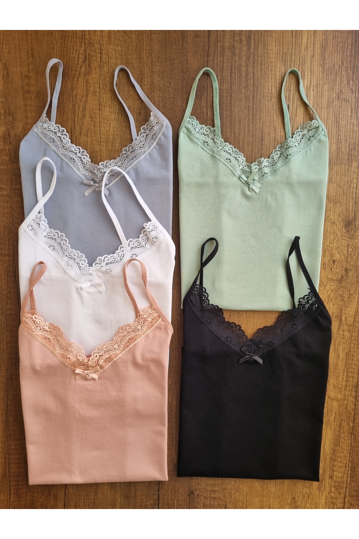 Kadın 5'li Paket Dantelli Pamuklu İp Askılı Atlet Mavi, Yeşil, Pudra, Siyah, Beyaz Kadın 5'li Paket Dantelli Pamuklu İp Askılı Atlet Mavi, Yeşil, Pudra, Siyah, Beyaz D-1137 XL