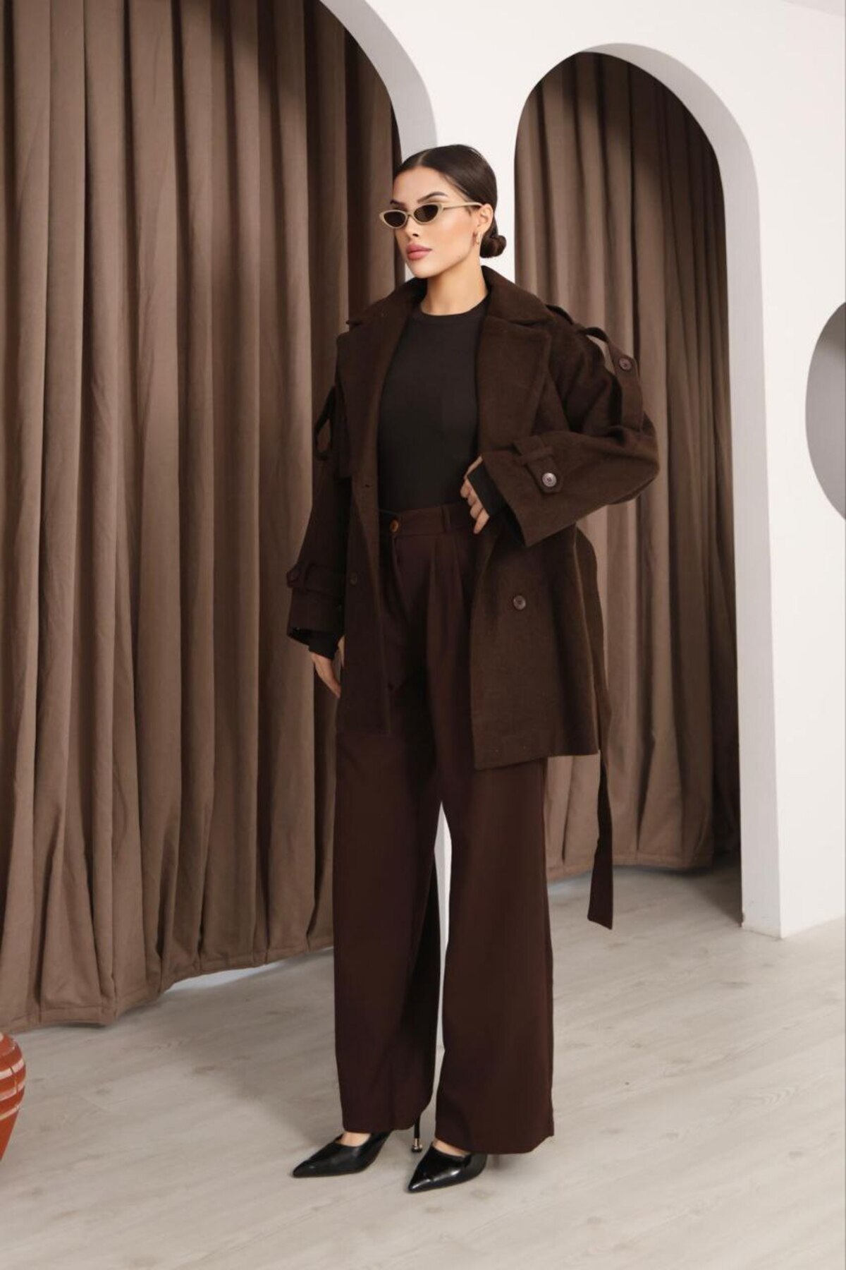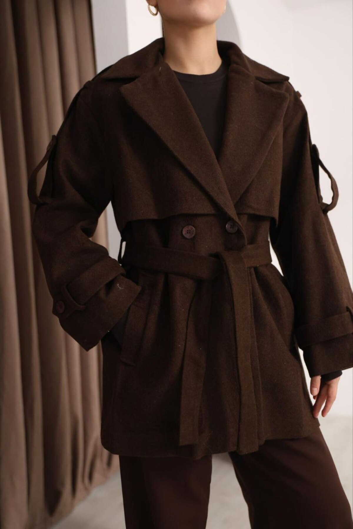 Kruvaze Apolet Detaylı Oversize Kuşaklı Kaşe Kaban Kruvaze Apolet Detaylı Oversize Kuşaklı Kaşe Kaban 7020 L