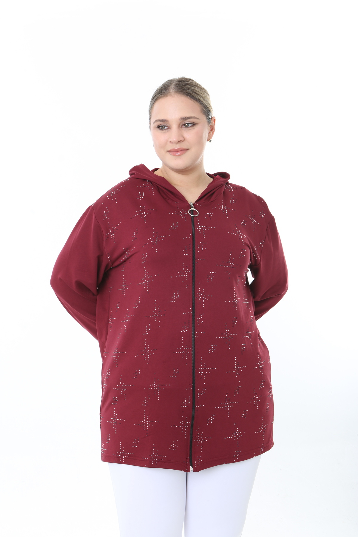 kadın likralı kapüşonlu taş baskılı bordo büyük beden hırka kadın likralı kapüşonlu taş baskılı bordo büyük beden hırka H10617 58-60