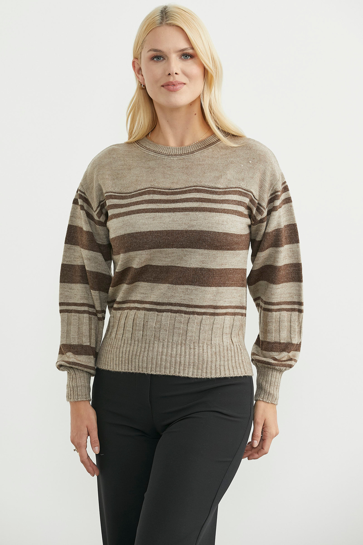 Çizgili Yünlü Triko Kazak - Bej Çizgili Yünlü Triko Kazak - Bej 25K2115-32623.0001 M