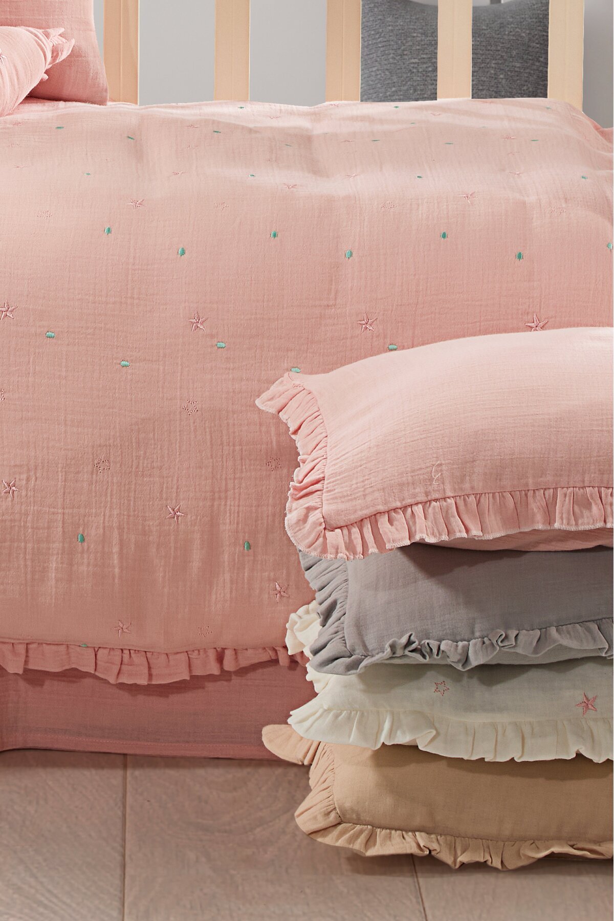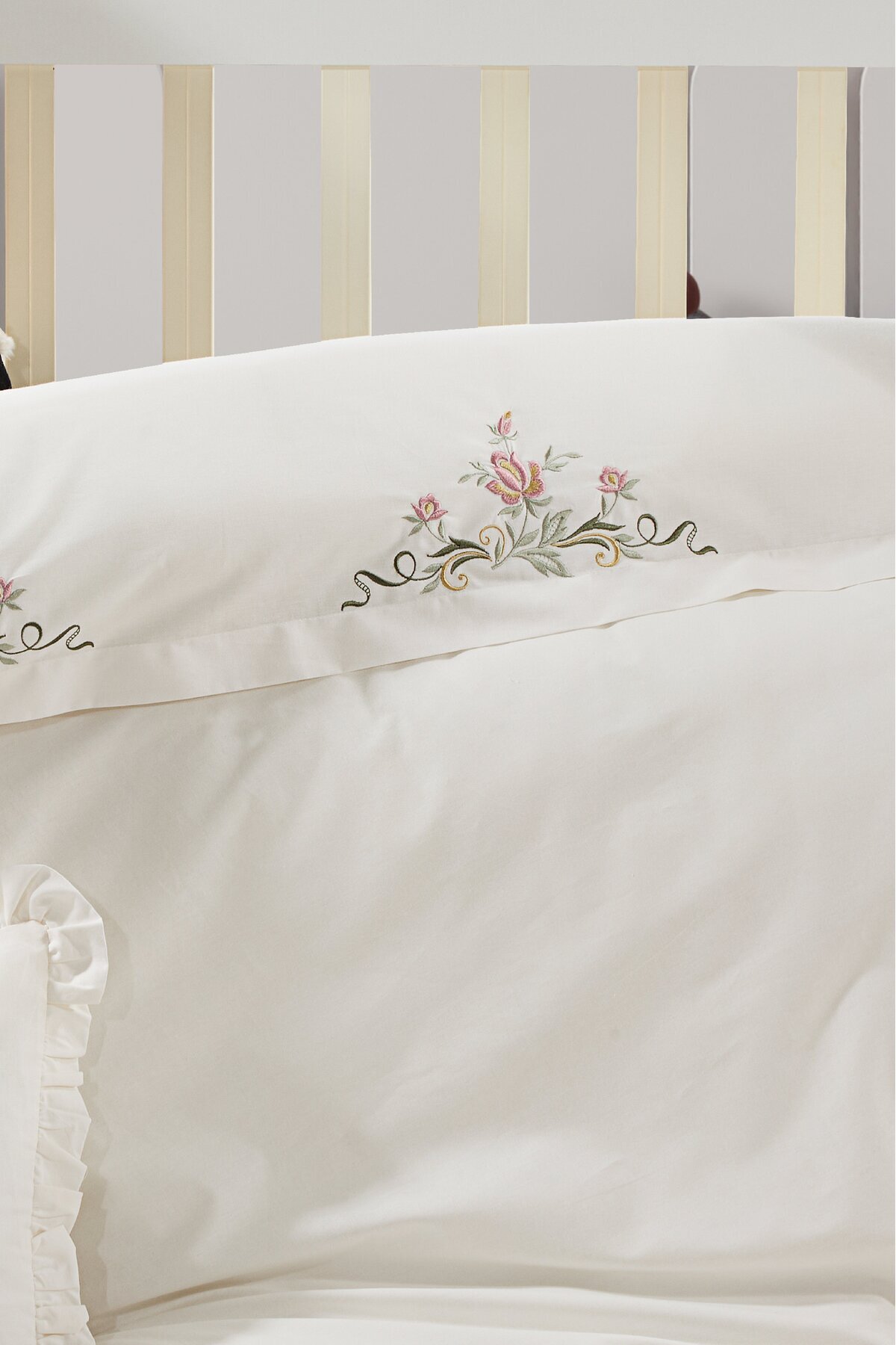 %100 Pamuk Çiçekli Nakışlı İşlemeli Fırfırlı Bebek Nevresim Takımı %100 Pamuk Çiçekli Nakışlı İşlemeli Fırfırlı Bebek Nevresim Takımı MNR15PMKÇÇKL تک سایز