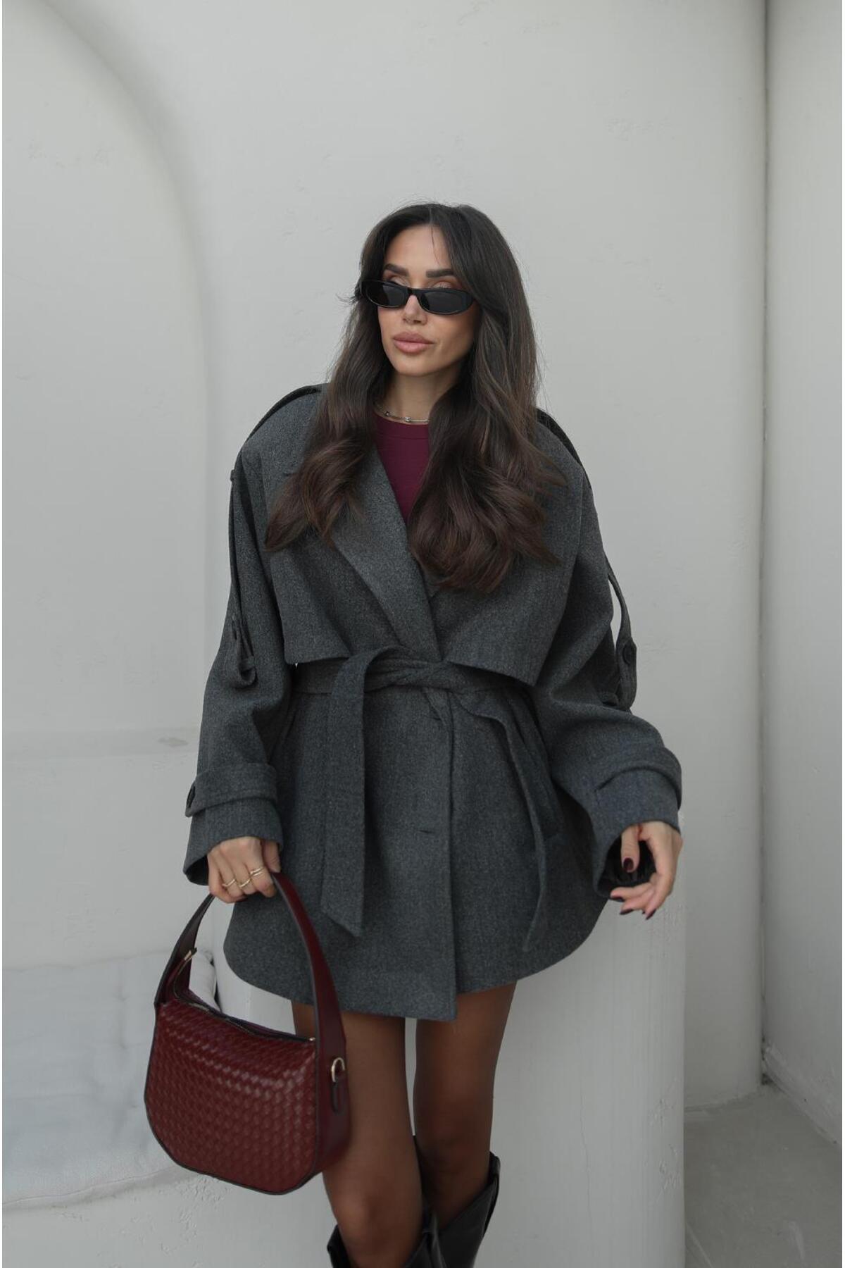 Gri Rebello Kuşaklı Kaşe Kaban Gri Rebello Kuşaklı Kaşe Kaban Hkab240 Standart