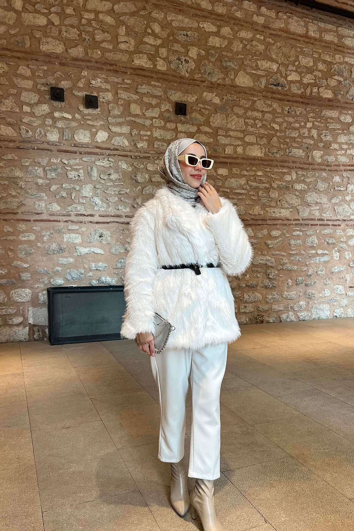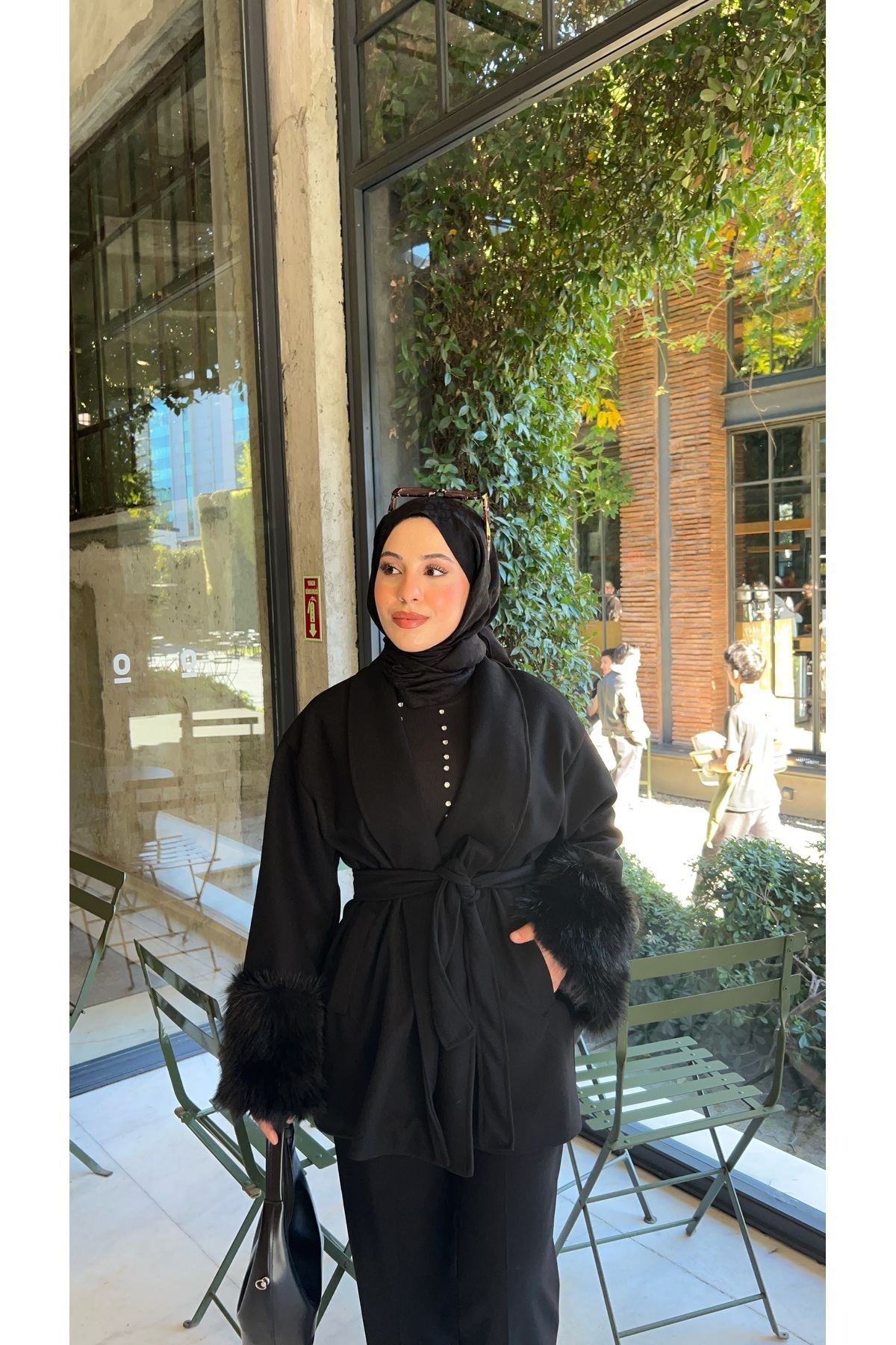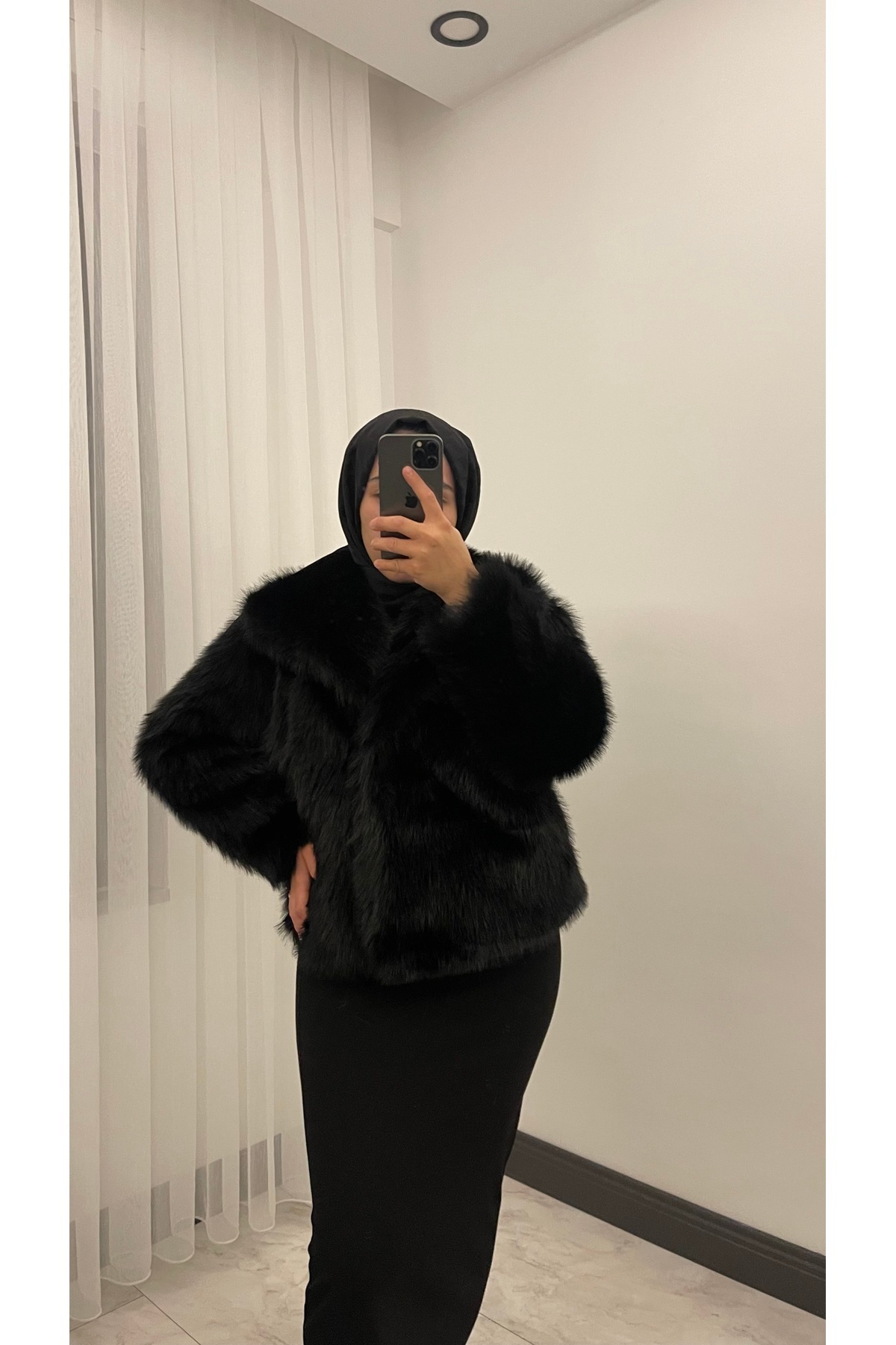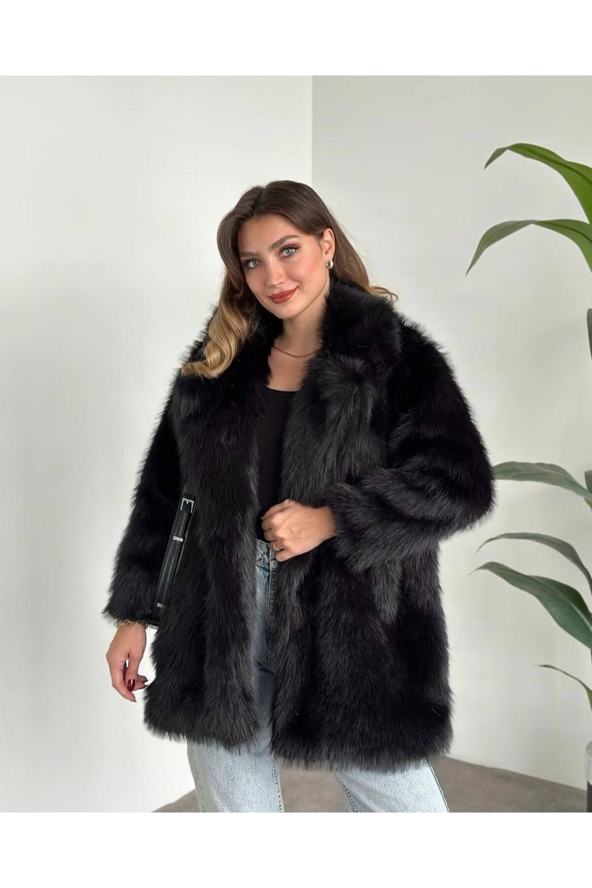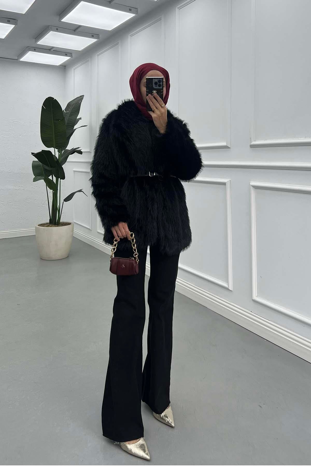 Kemerli Astarlı Kürk Kaban Siyah Kemerli Astarlı Kürk Kaban Siyah PDBD9156 XL