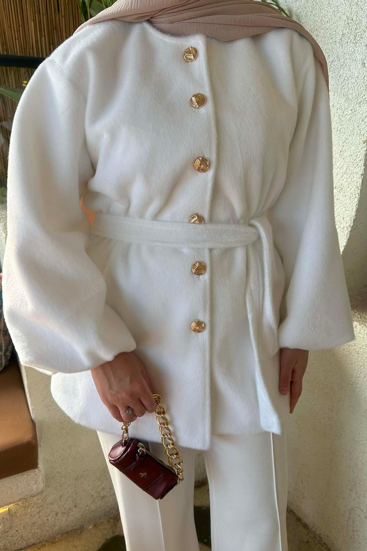 Balon Kol Kuşaklı Kürklü Kaban Beyaz Balon Kol Kuşaklı Kürklü Kaban Beyaz PDTB4026 2