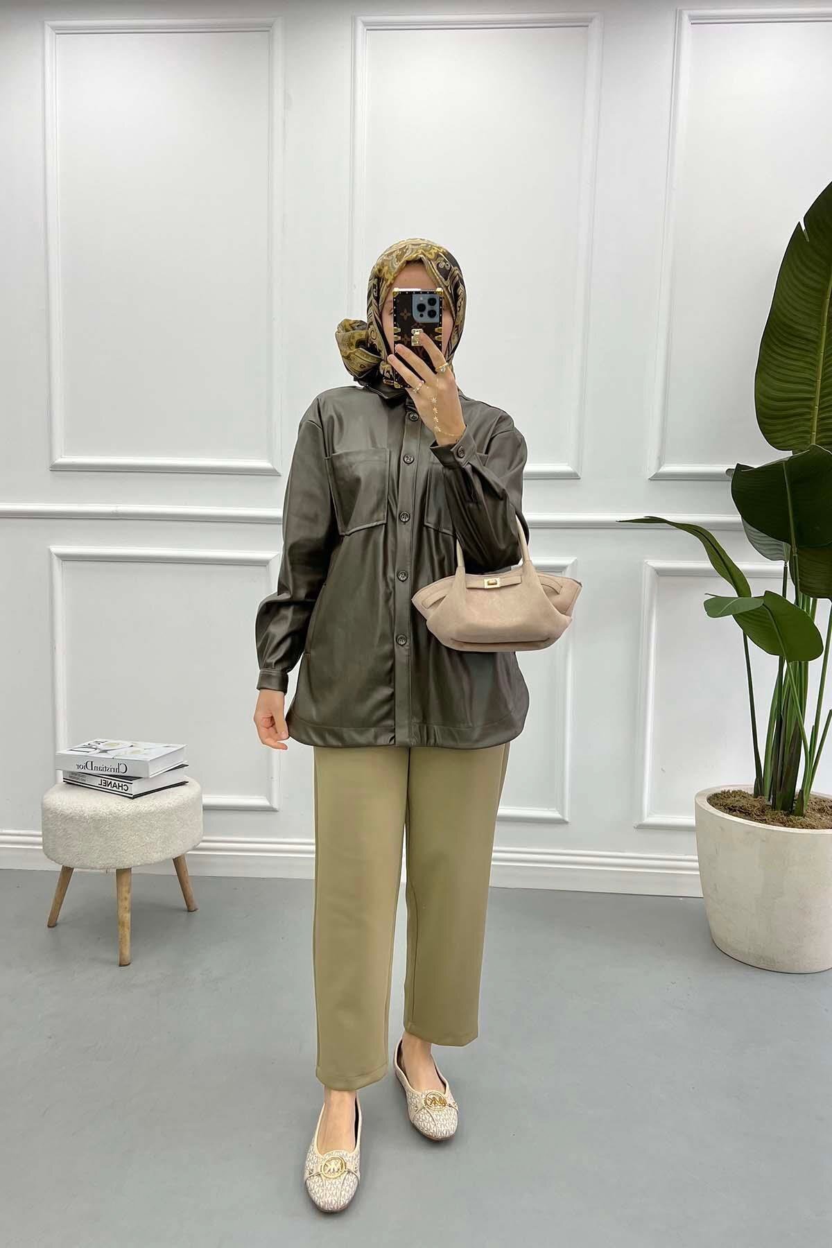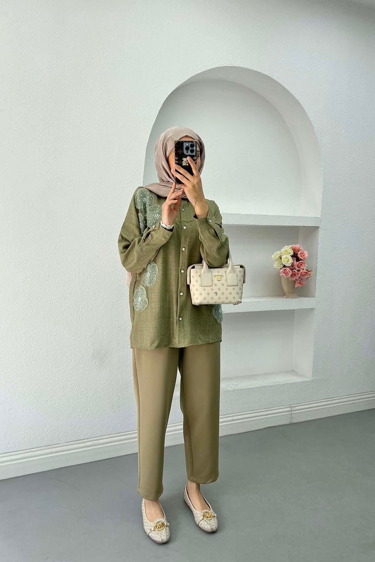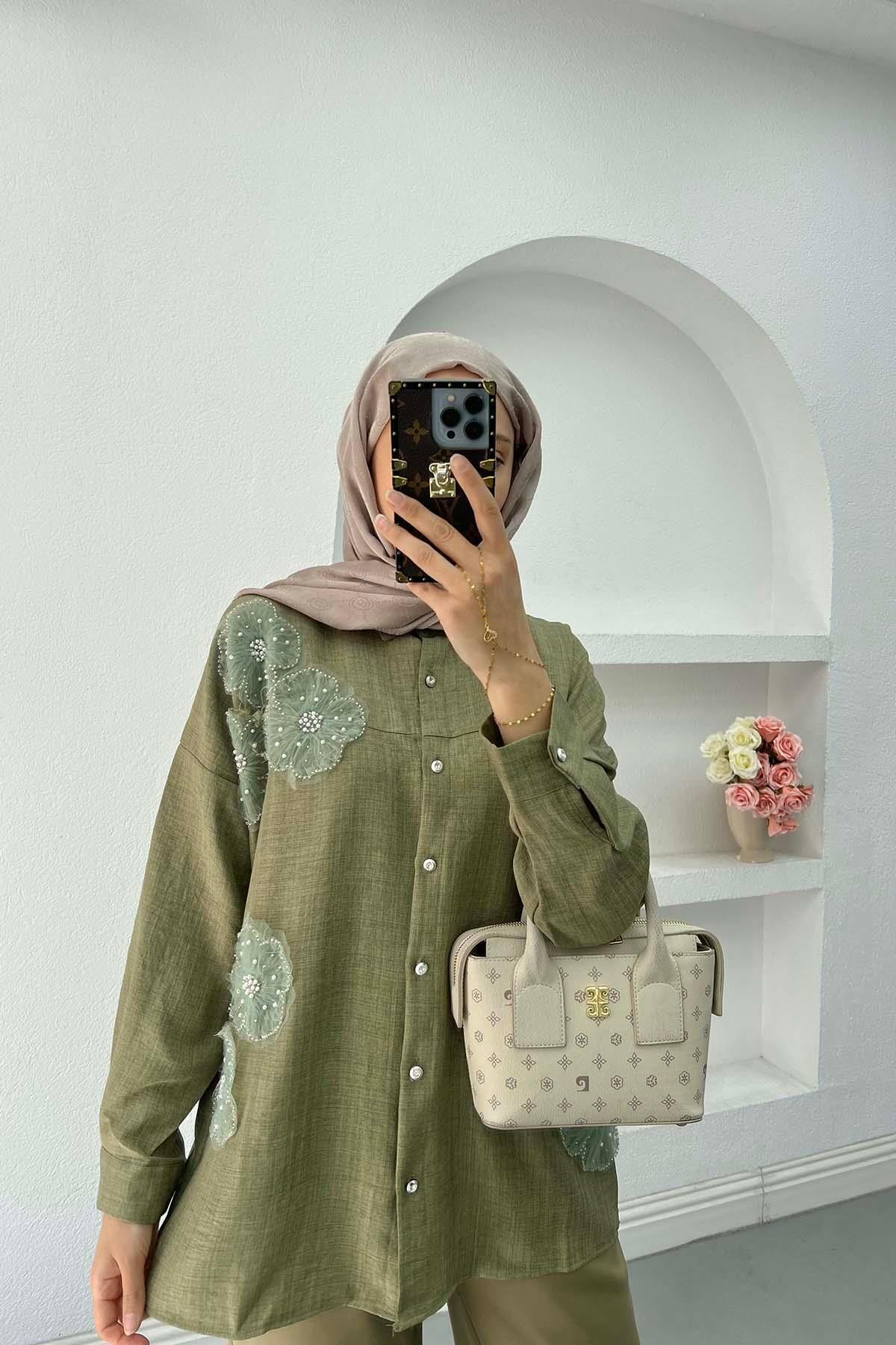 Tül Çiçekli Boncuk İşlemeli Gömlek Yeşil Tül Çiçekli Boncuk İşlemeli Gömlek Yeşil PDHTA7944 L