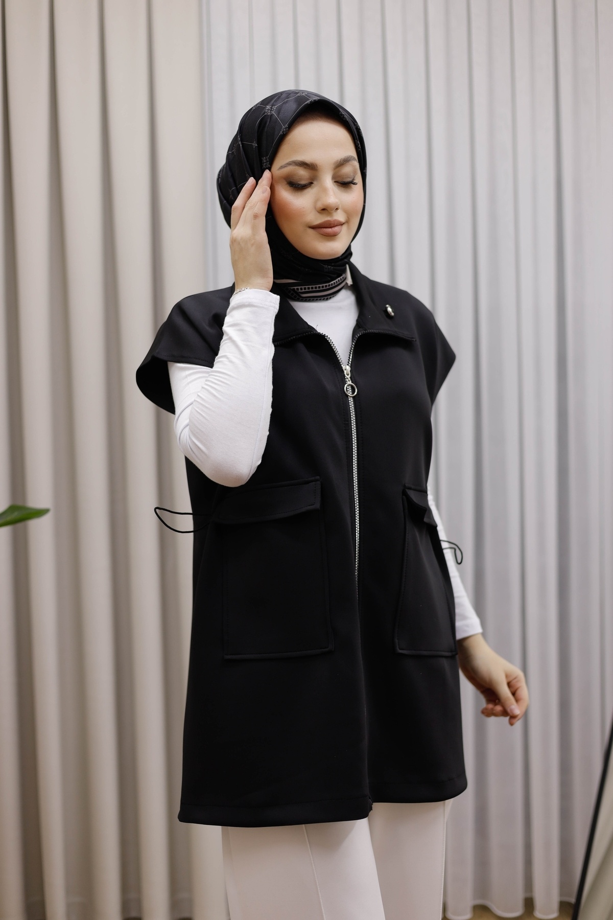 Kadın ÇİFT CEPLİ VE FERMUARLI TESETTÜR YELEK - Siyah Kadın ÇİFT CEPLİ VE FERMUARLI TESETTÜR YELEK - Siyah DSM2025Y001 L/XL
