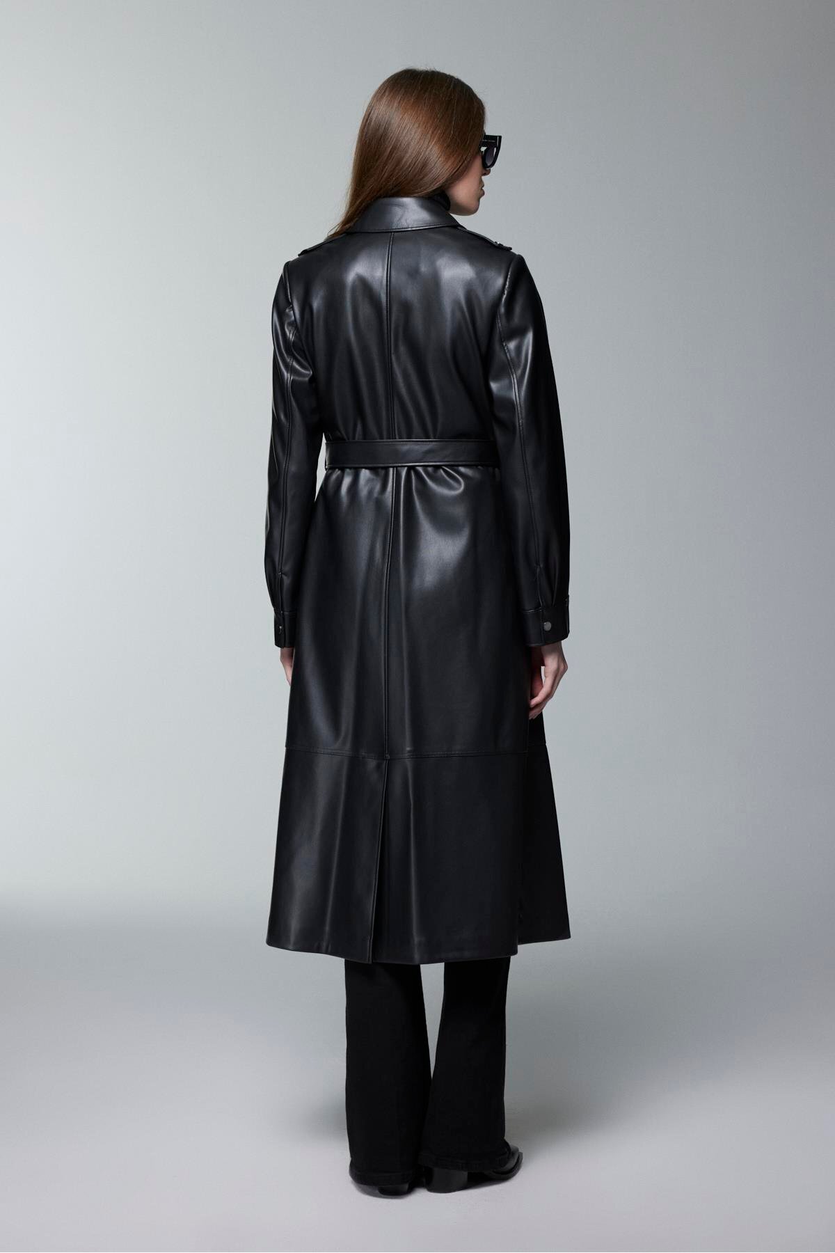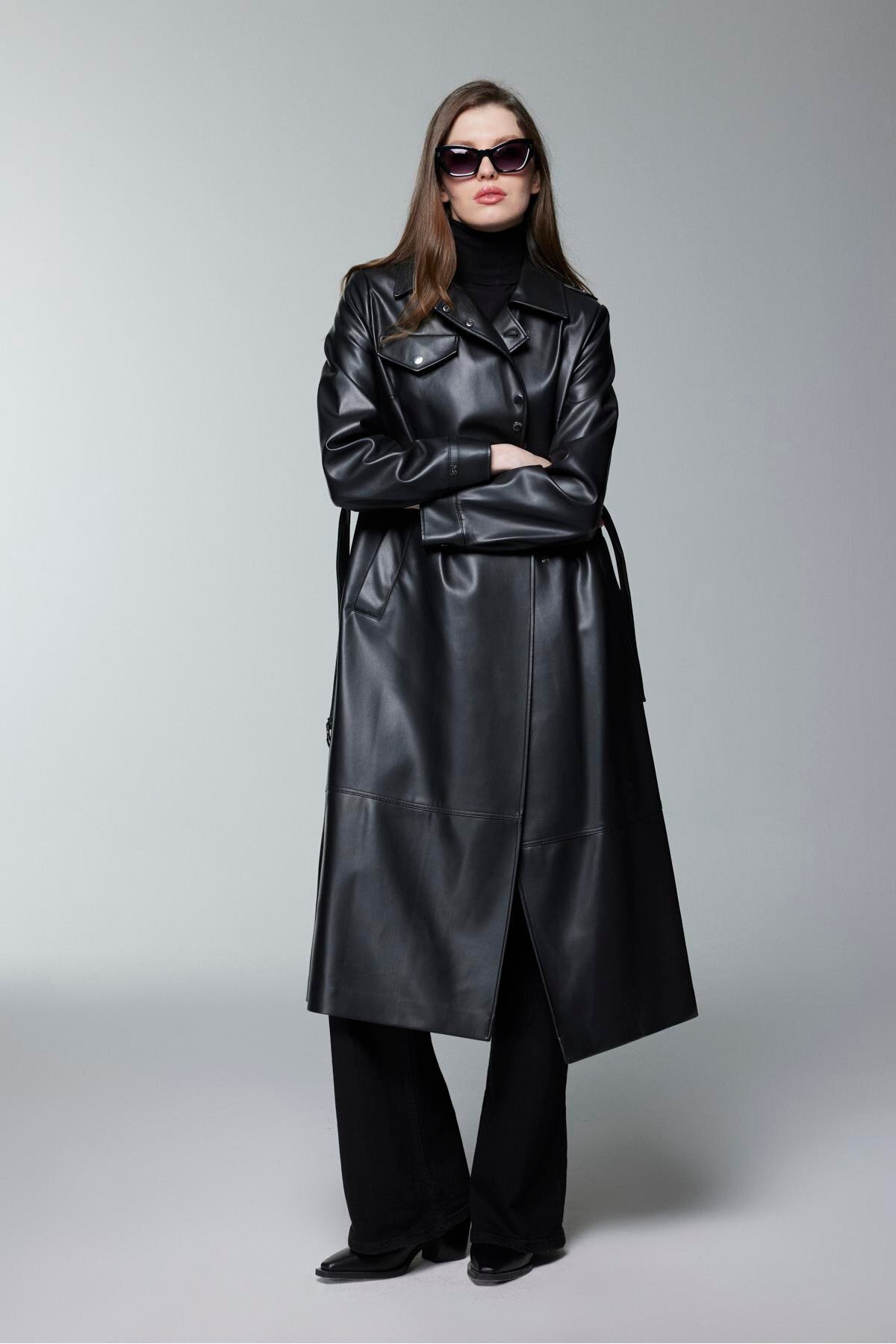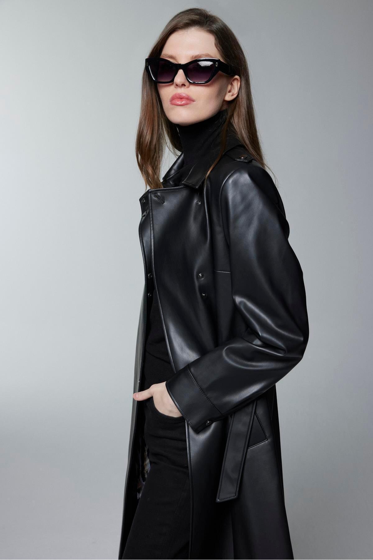 Gömlek Yaka Kemer Detaylı Siyah Deri Trençkot 13823 Gömlek Yaka Kemer Detaylı Siyah Deri Trençkot 13823 Z25KB13823TR100001 42