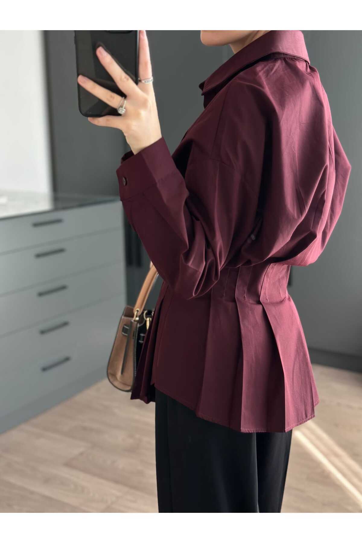 PİLİSE DETAYLI BELİ OTURTMALI BORDO GÖMLEK PİLİSE DETAYLI BELİ OTURTMALI BORDO GÖMLEK TGNSKU-0043 L
