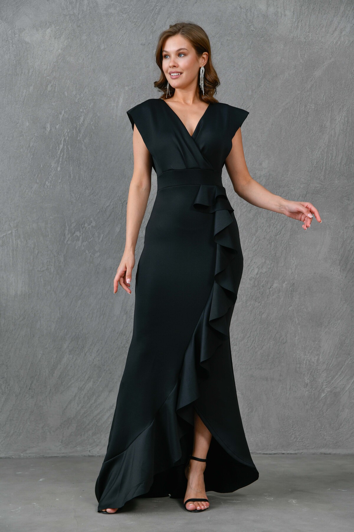 Kadın Siyah V Yaka Parıltılı Taş Detaylı Volanlı Abiye 01 Kadın Siyah V Yaka Parıltılı Taş Detaylı Volanlı Abiye 01 MTDROP-0233 2XL