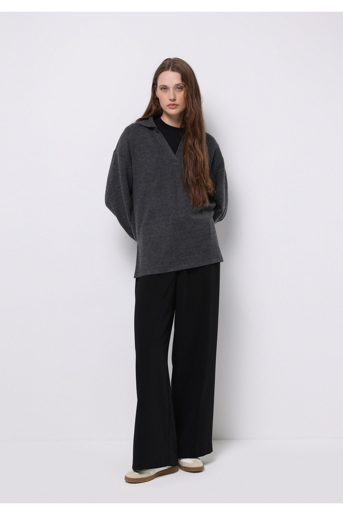 Regular Fit Polo Yaka Düz Kadın Antrasit Tişört Regular Fit Polo Yaka Düz Kadın Antrasit Tişört CL1076712_Q1.V2 L