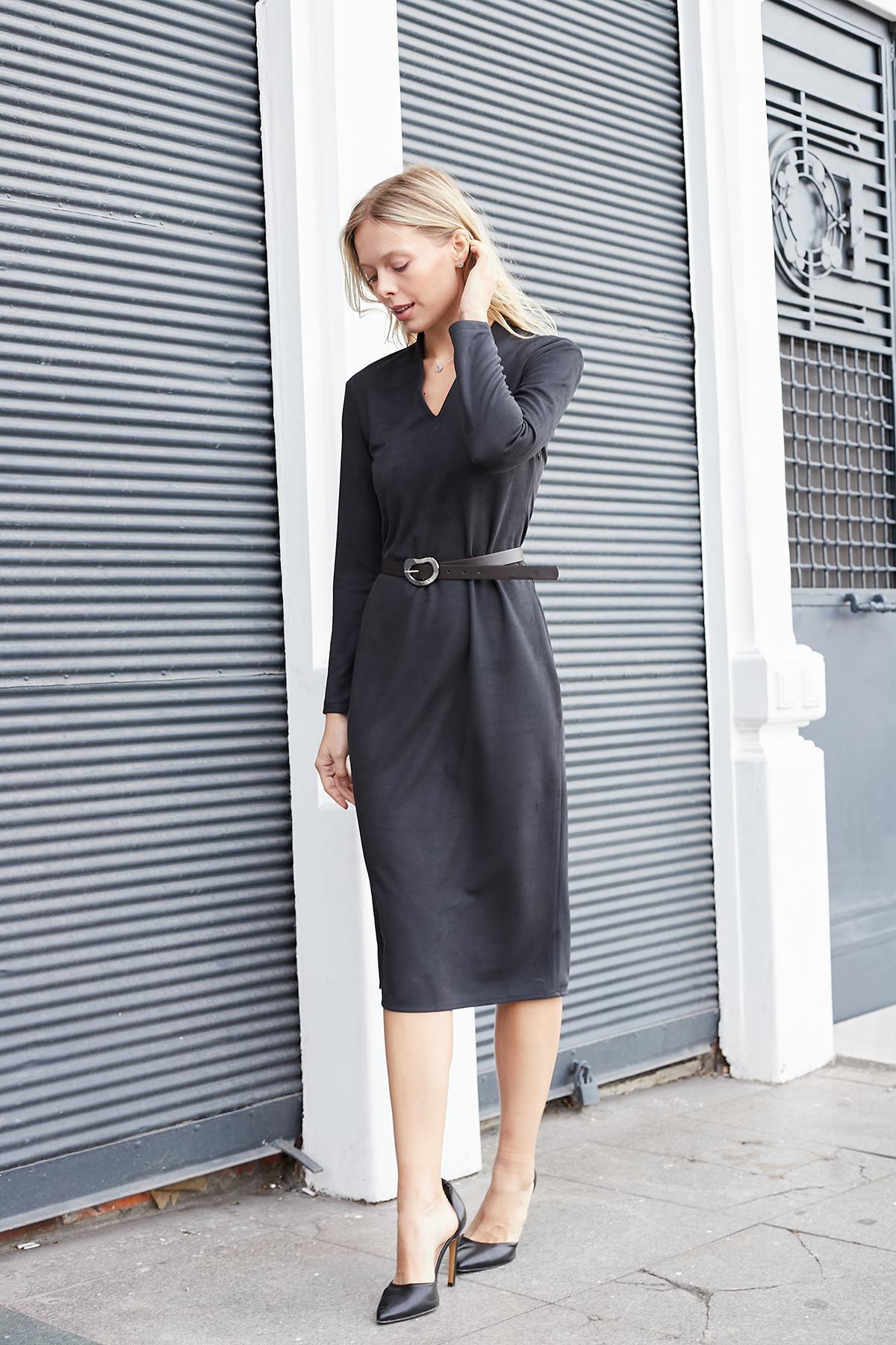 Kadın Süet Dokulu Hafif Esnek Kumaş V Yaka Uzun Kol Yırtmaçlı Deri Kemerli Diz Altı Uzun Elbise-Siya Kadın Süet Dokulu Hafif Esnek Kumaş V Yaka Uzun Kol Yırtmaçlı Deri Kemerli Diz Altı Uzun Elbise-Siya 50236 42