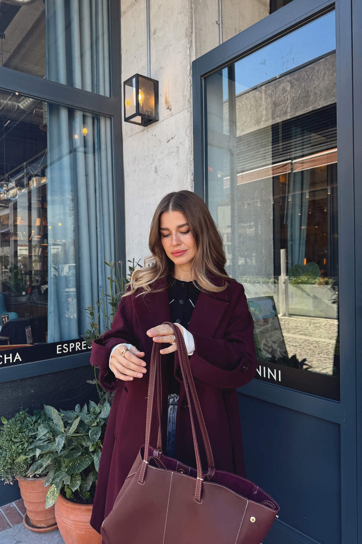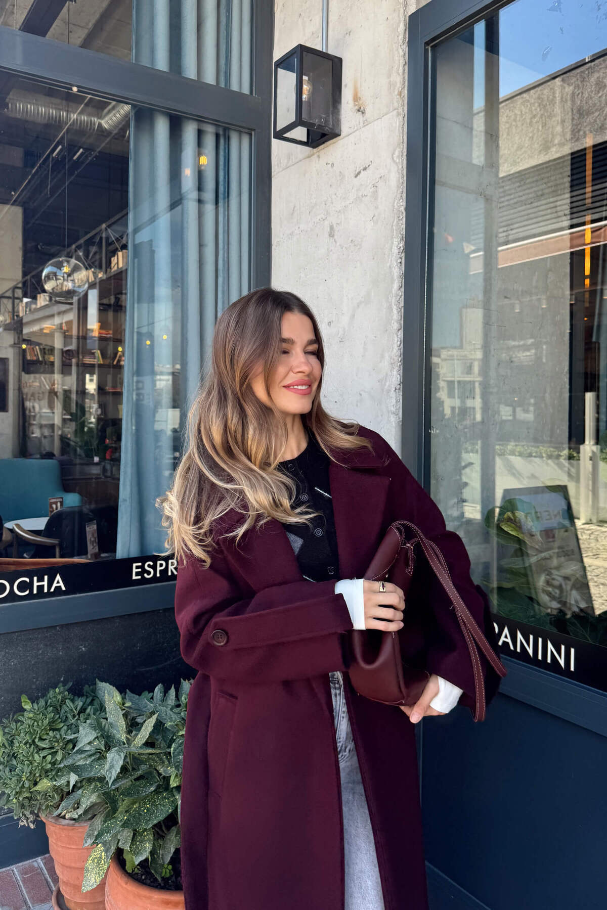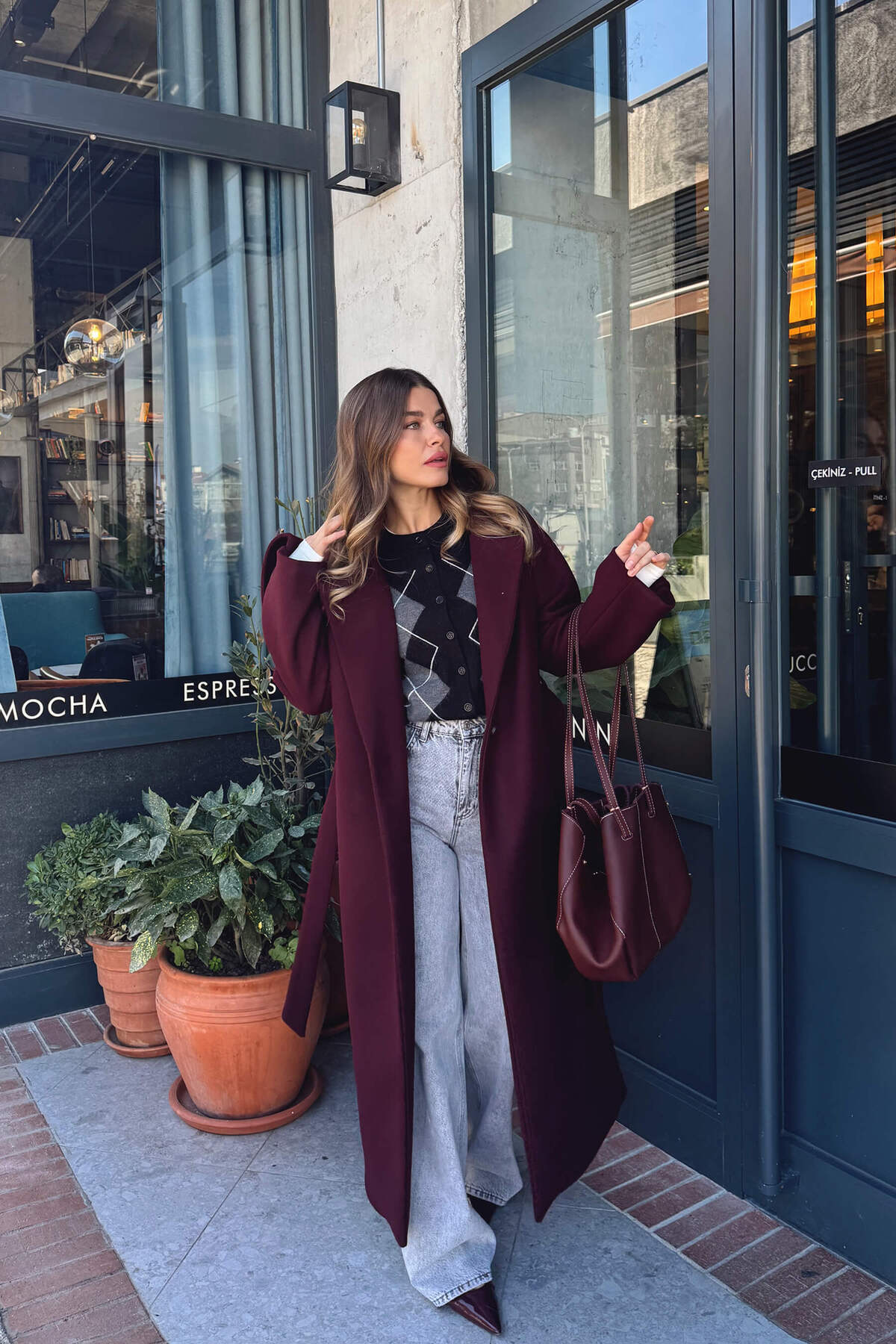 Bordo Kuşaklı Astarlı Oversize Kol Detay Yün Kaban Bordo Kuşaklı Astarlı Oversize Kol Detay Yün Kaban KBN1006 XL