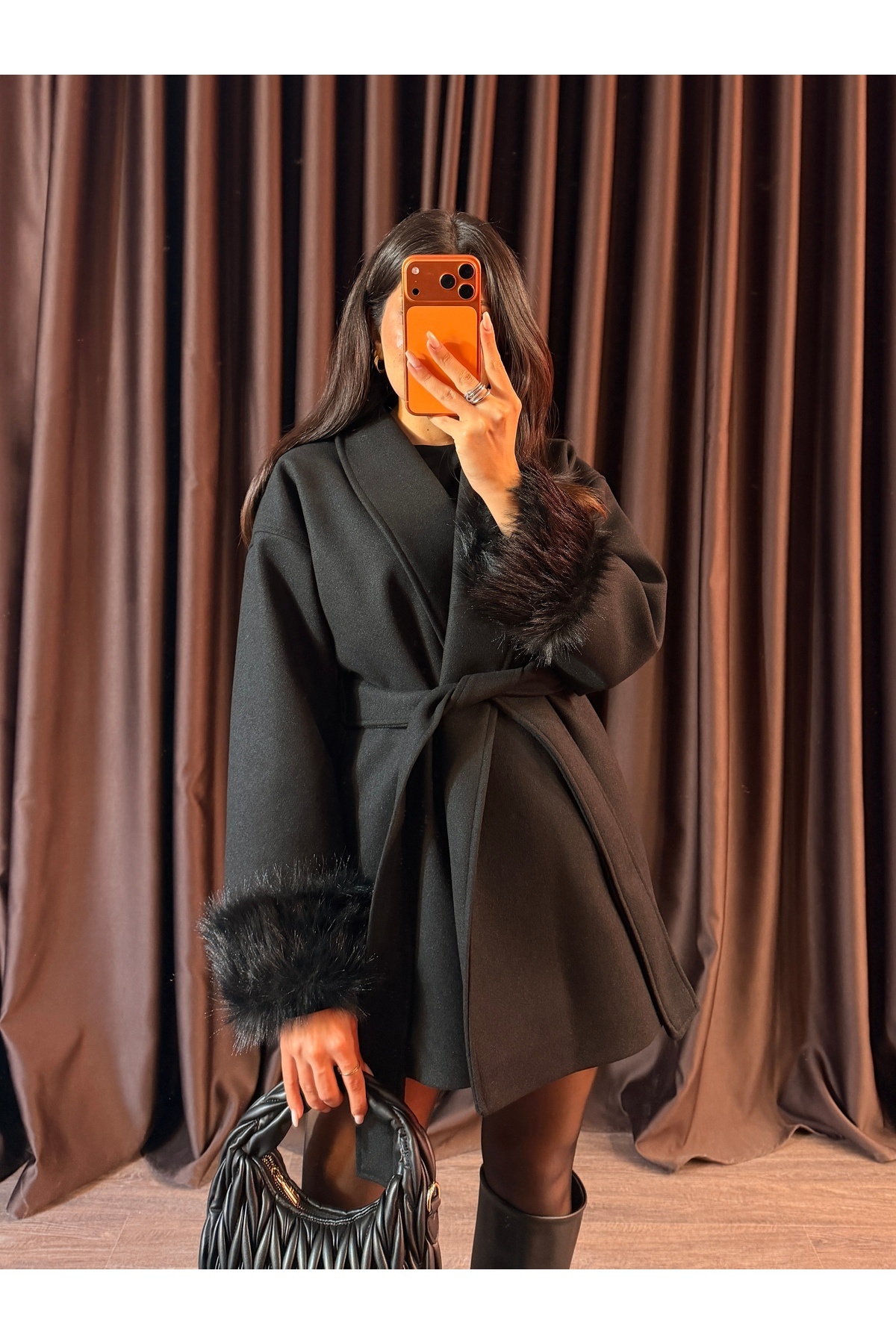 Kadın Kolları Kürklü Kuşaklı Kaşe Kaban Kadın Kolları Kürklü Kuşaklı Kaşe Kaban 00147 L