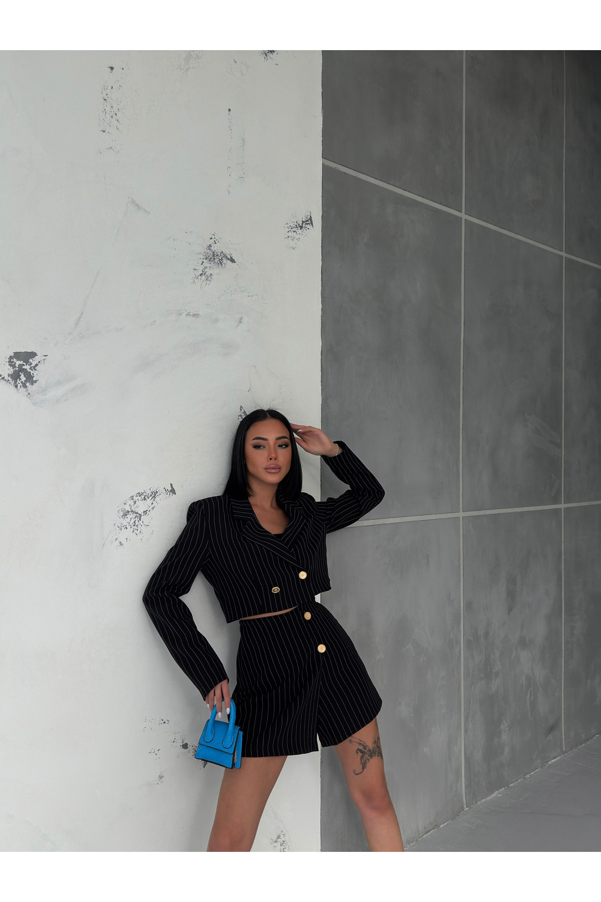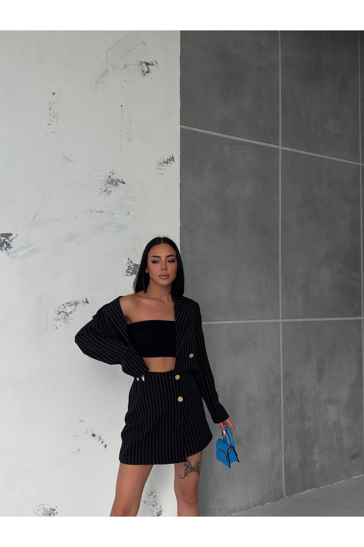 Kadın Çizgili Crop Ceket Şort Etek Takım Kadın Çizgili Crop Ceket Şort Etek Takım ALALD-070 L