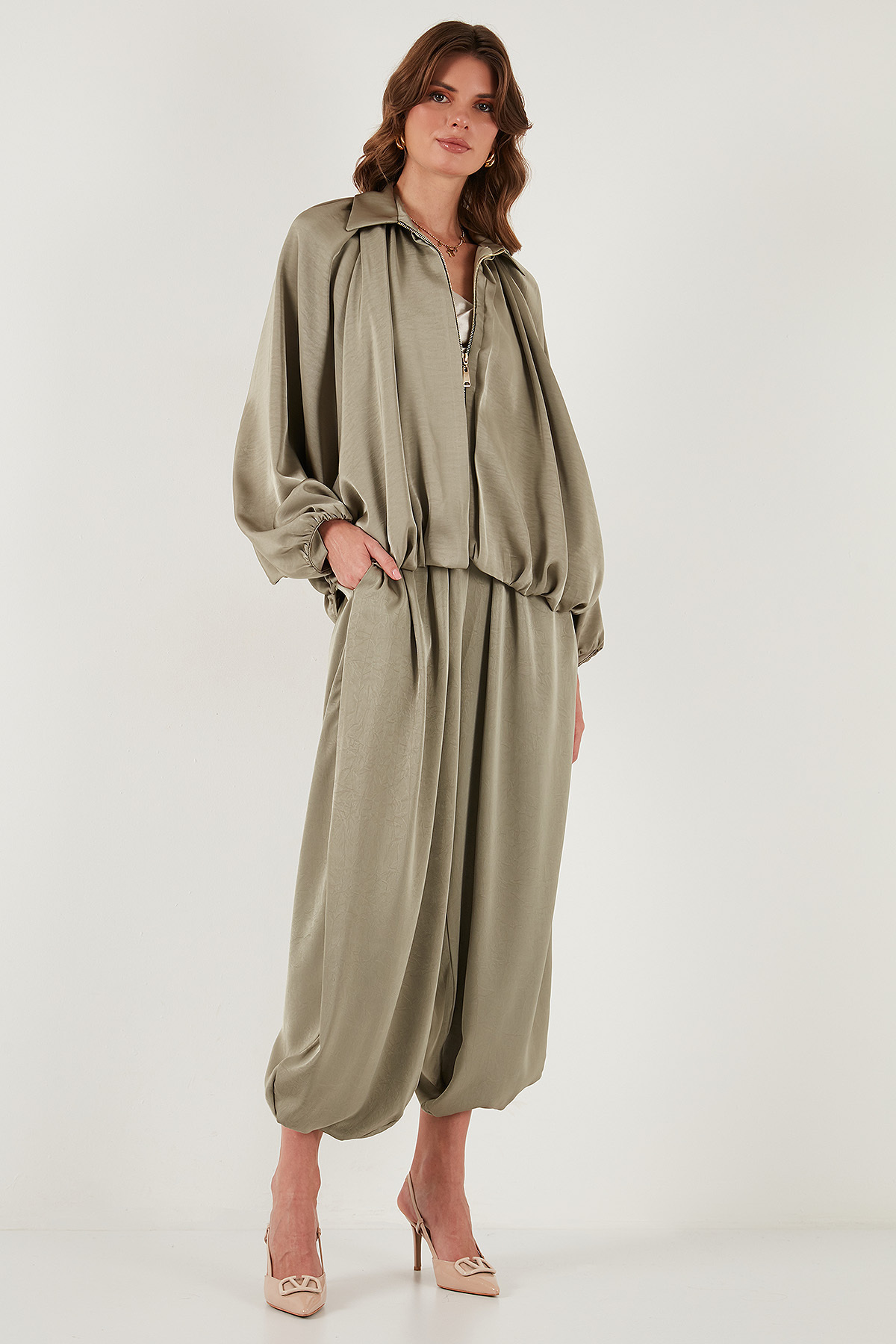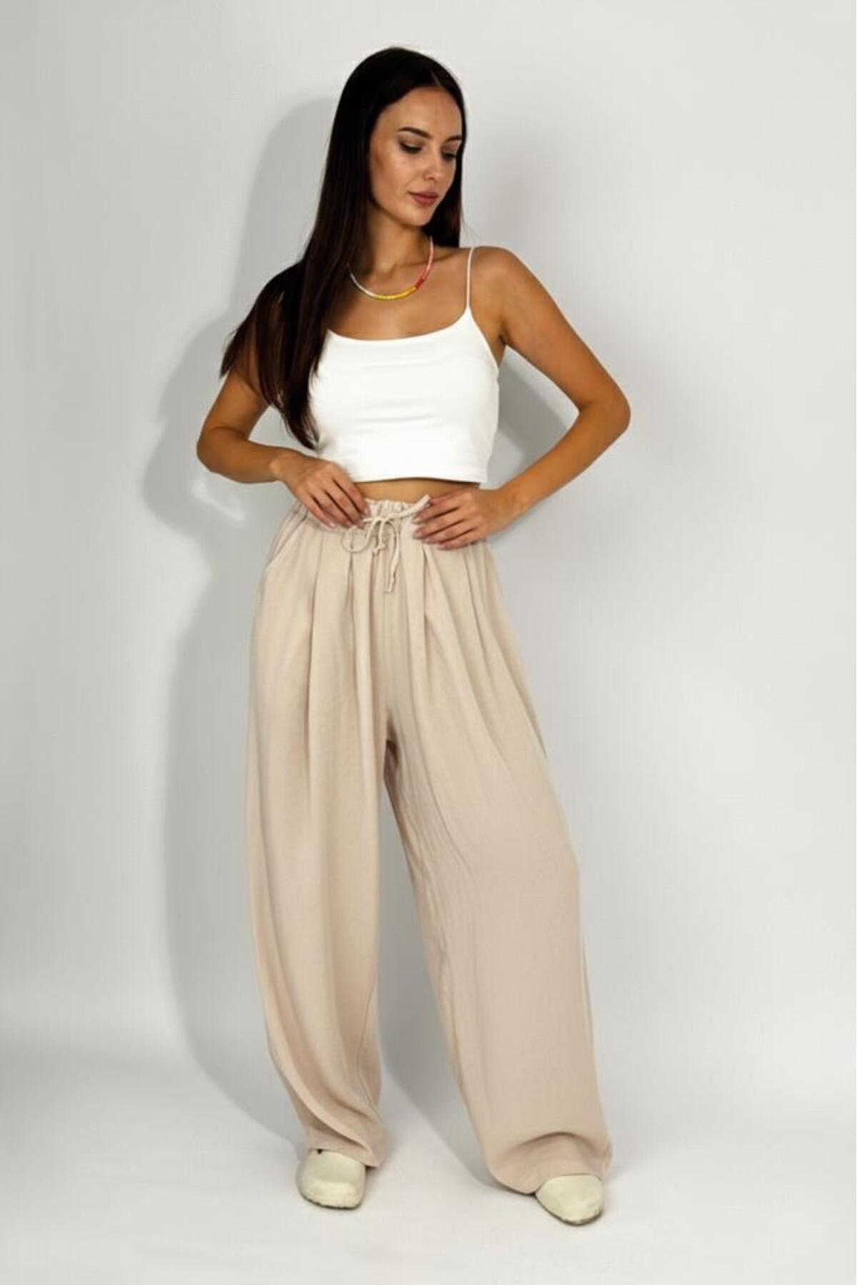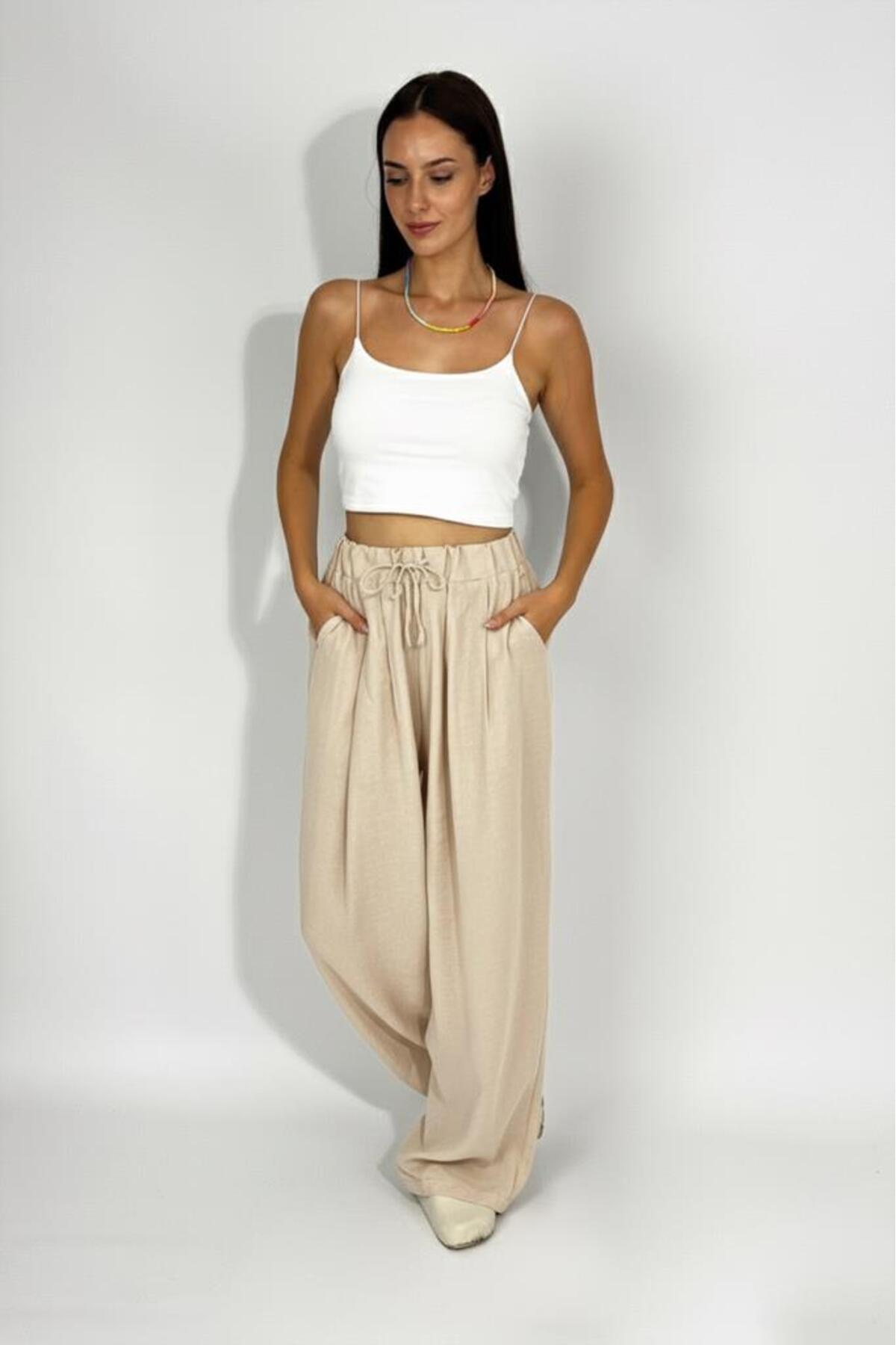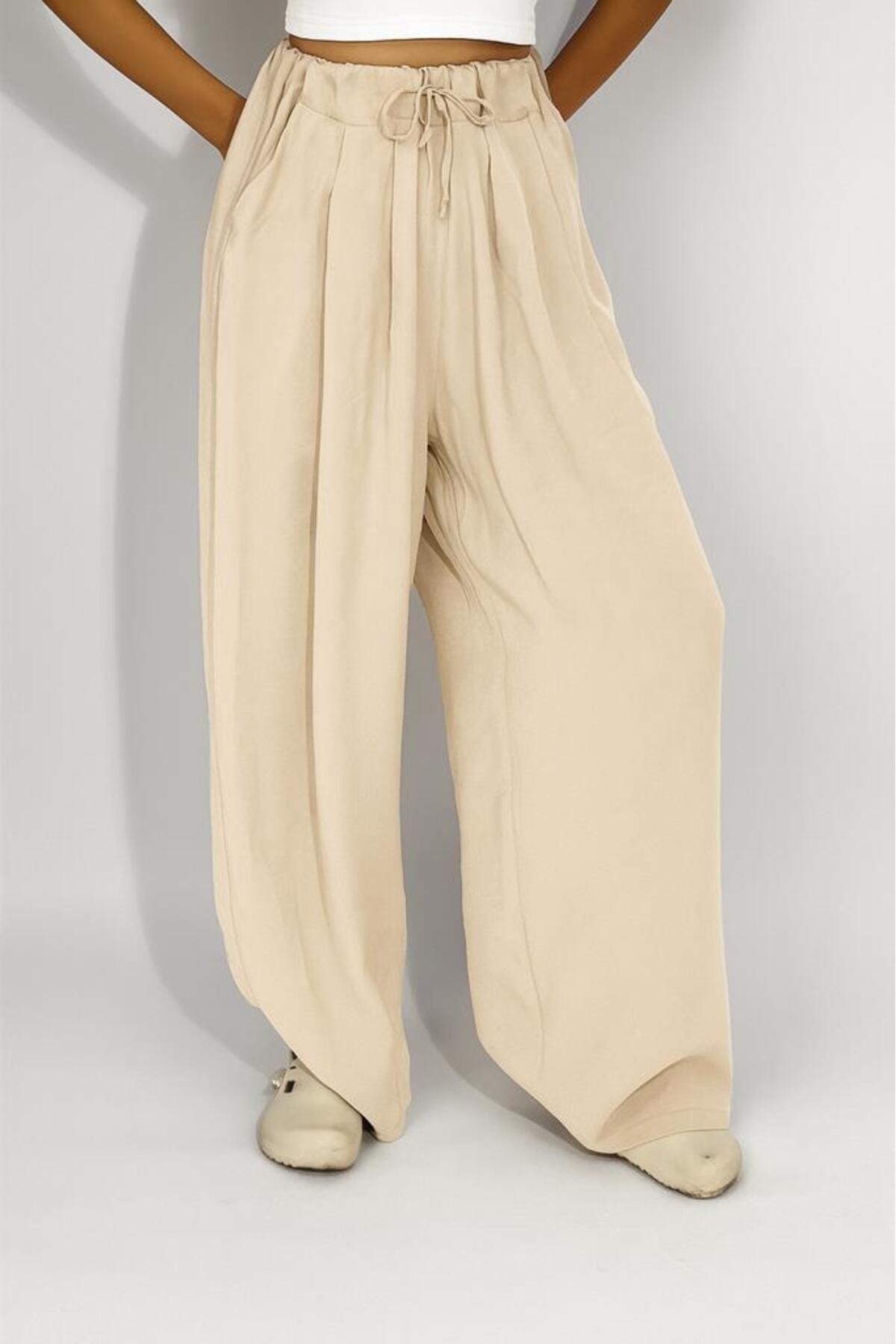 Kadın Dokuma Modal Beli Lastikli Geniş Paça Cepli İpli Palazzo Pantolon Vizon Kadın Dokuma Modal Beli Lastikli Geniş Paça Cepli İpli Palazzo Pantolon Vizon Perry.İpli.Pant L