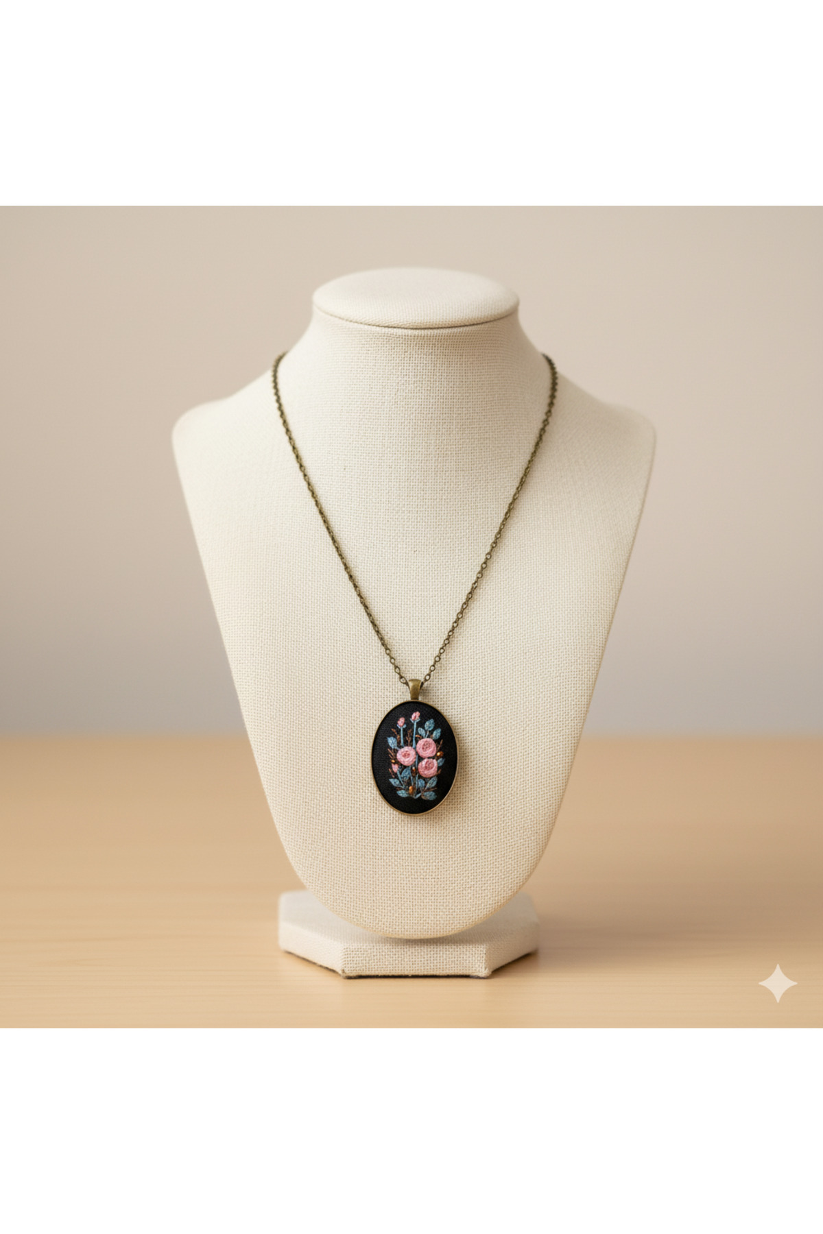 El Yapımı Nakış Kolye Gül Desenli Vintage Kanaviçe Etamin Tarzı İşlemeli Siyah Oval Kolye El Yapımı Nakış Kolye Gül Desenli Vintage Kanaviçe Etamin Tarzı İşlemeli Siyah Oval Kolye 000605