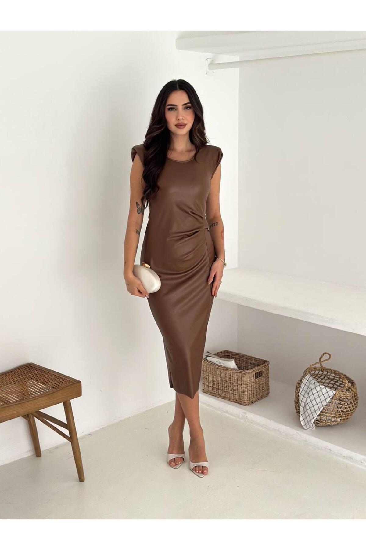 Kadın Kahverengi Kısa Kol Yırtmaç Ve Kemer Detaylı Midi Deri Elbise Kadın Kahverengi Kısa Kol Yırtmaç Ve Kemer Detaylı Midi Deri Elbise 5017as L